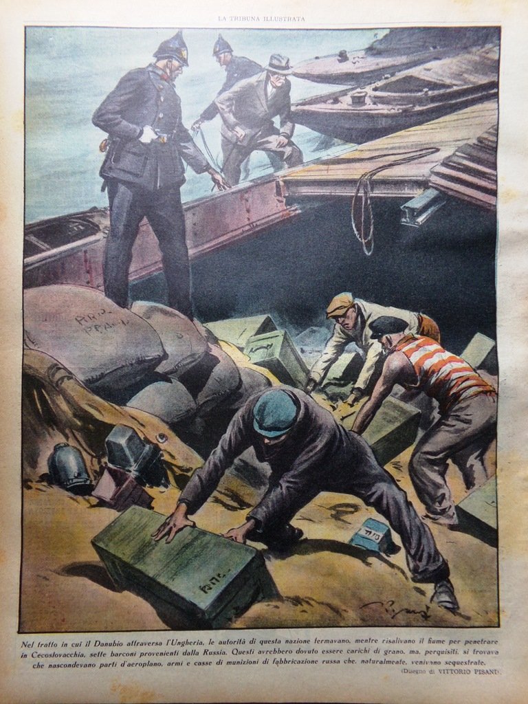 Nel tratto in cui il Danubio attraversa l'Ungheria, le autorità di questa nazione fermavano, mentre risalivano il fiume per penetrare in Cecoslovacchia, sette barconi provenienti dalla Russia. Questi avrebbero dovuto essere carichi di grano, ma, perquisiti, si trovava che nascondevano parti d'aeroplano, armi e casse di munizioni di fabbricazione russa che, naturalmente, venivano sequestrate (disegno di Vittorio Pisani)