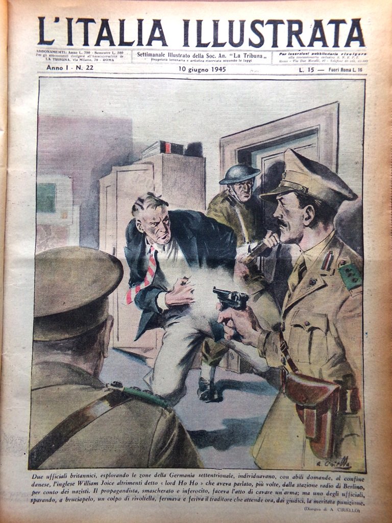 Due ufficiali britannici, esplorando le zone della Germania settentrionale, individuavano, con abili domande, al confine danese, l'inglese William Joyce altrimenti detto "Lord Haw-Haw" che aveva parlato più volte dalla stazione radio di Berlino, per conto dei nazisti. Il propagandista smascherato e inferocito, faceva l'atto di cavare un'arma; ma uno degli ufficiali, sparando a bruciapelo un colpo di rivoltella, fermava e feriva il traditore che attende ora, dai giudici, la meritata punizione (disegno di A. Ciriello)