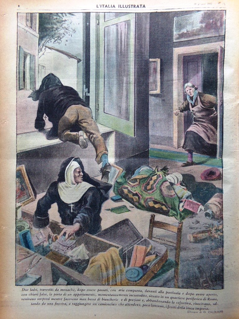 Due ladri, travestiti da monache, dopo essere passati, con aria compunta, davanti alla portinaia e dopo avere aperto, con chiavi false, la porta di un appartamento, momentaneamente incustodito, situato in un quartiere periferico di Roma, venivano sorpresi mentre facevano man bassa di biancheria e di preziosi e, abbandonando la refurtiva, riuscivano, saltando da una finestra, a raggiungere un camioncino che attendeva, poco lontano ,i frutti della losca impresa (disegno di O. Calderisi)