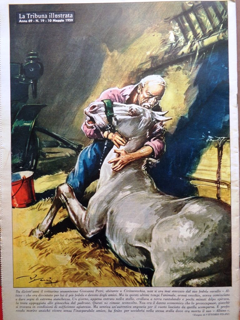 Da 18 anni il vetturino sessantenne Giovanni Petri, abitante a Civitavecchia, non si era mai staccato dal suo fedele cavallo "Albino" che era diventato per lui il più fedele e devoto degli amici. Ma in questi ultimi tempi l'animale, ormai vecchio, aveva cominciato a dare segni di estrema stanchezza. Un giorno, appena entrato nella stalla, crollava a terra rantolando e pochi minuti dopo spirava, la testa appoggiata alle ginocchia del padrone. Questi ne rimase sconvolto. Non era il danno economico che lo preoccupasse, giacché si trovava in condizioni di sufficiente agiatezza. Ma sentiva un'autentica angoscia per il vuoto lasciato da quella scomparsa. E preferendo morire anziché vivere senza l'inseparabile amico, ha finito per uccidersi nella stessa stalla dove era morto il suo "Albino" (disegno di Vittorio Pisani)