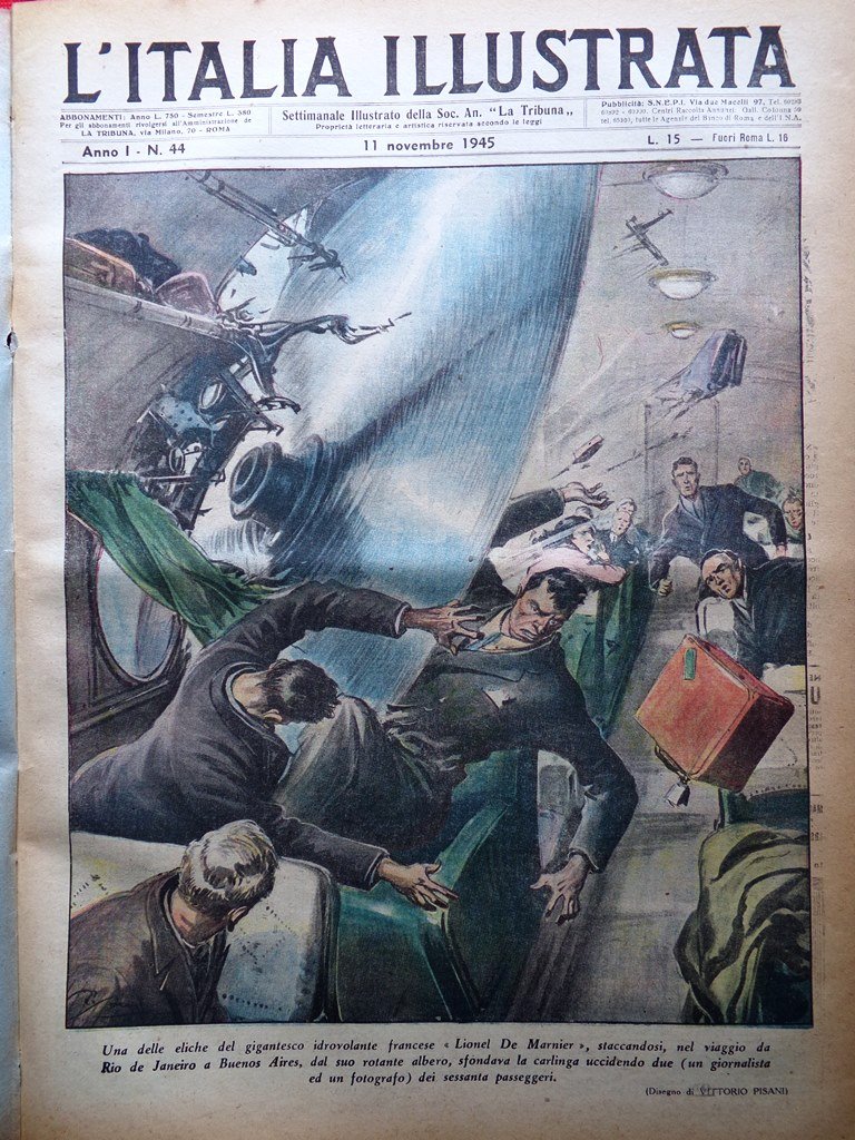 Una delle eliche del gigantesco idrovolante francese "Lionel De Marnier", staccandosi, nel viaggio da Rio de Janeiro a Buenos Aires, dal suo rotante albero, sfondava la carlinga uccidendo due (un giornalista ed un fotografo) dei sessanta passeggeri (disegno di Vittorio Pisani)