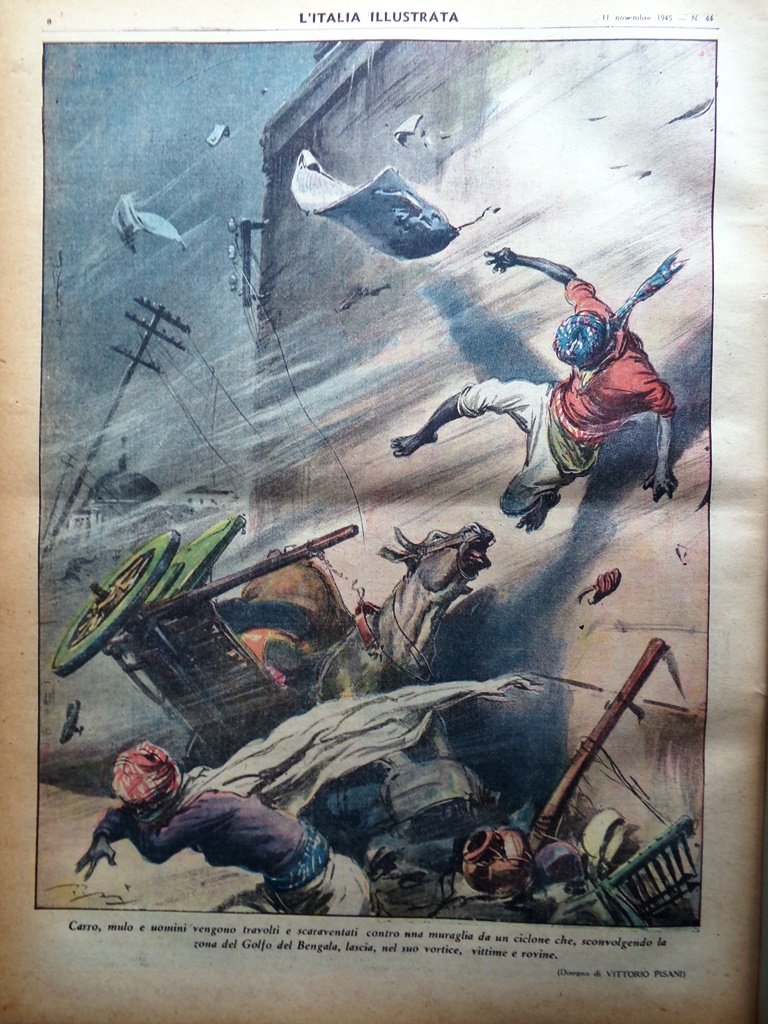 Carro, mulo e uomini vengono travolti e scaraventati contro una muraglia da un ciclone che, sconvolgendo la zona del Golfo del Bengala, lascia, nel suo vortice vittime e rovine (disegno di Vittorio Pisani)