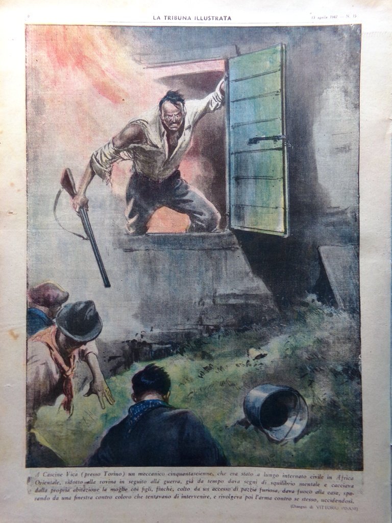 A Cascine Vica (presso Torino) un meccanico cinquantaseienne, che era stato a lungo internato civile in Africa Orientale, ridotto alla rovina in seguito alla guerra, già da tempo dava segni di squilibrio mentale e cacciava dalla propria abitazione la moglie coi figli, finché, colto da un accenno di pazzia furiosa, dava fuoco alla casa, sparando da una finestra contro coloro che tentavano di intervenire, e rivolgeva poi l'arma contro se stesso uccidendosi (disegno di Vittorio Pisani)