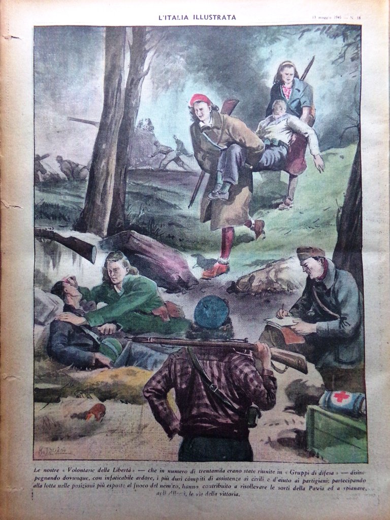 Le nostre "Volontarie" della Libertà, che in numero di trentamila erano state riunite in "Gruppi di difesa" disimpegnando dovunque, con infaticabile ardore, i più duri compiti di assistenza ai civili e d'aiuto ai partigiani: partecipando alla lotta nelle posizioni più esposte al fuoco del nemico, hanno contribuito a risollevare le sorti della Patria ed a spianare agli Alleati le vie della vittoria