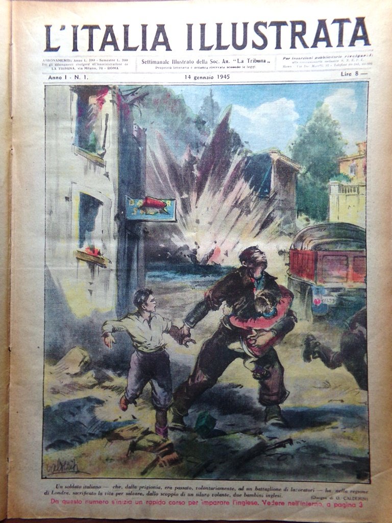 Un soldato italiano, che dalla prigionia era passato volontariamente ad un battaglione di lavoratori, ha nella regione di Londra sacrificato la vita per salvare, dallo scoppio di un siluro volante, due bambini inglesi (disegno di O. Calderisi)