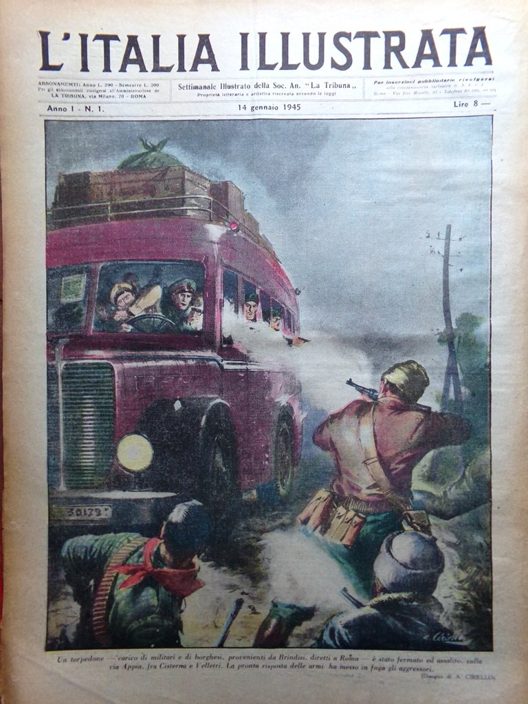 Un torpedone, carico di militari e di borghesi, provenienti da Brindisi, diretti a Roma, è stato fermato ed assalito sulla Via Appia, fra Cisterna e Velletri. La pronta risposta delle armi ha messo in fuga gli aggressori (disegno di A. Ciriello)