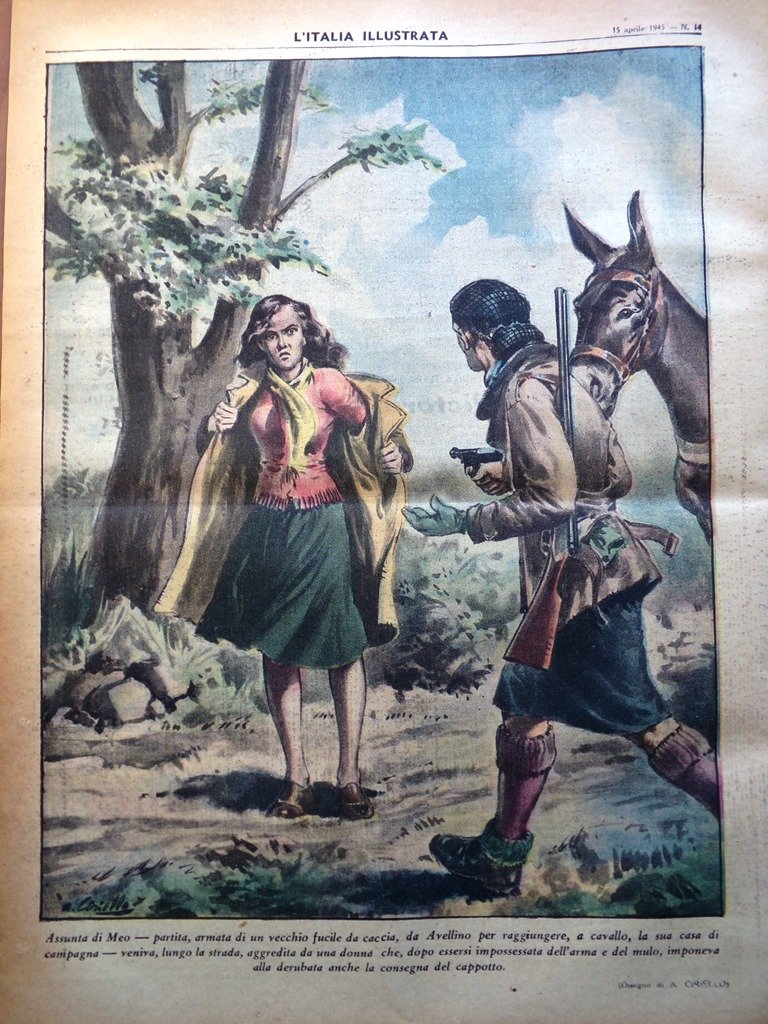 Assunta di Meo, partita armata di un vecchio fucile da caccia, da Avellino per raggiungere a cavallo la sua casa di campagna, veniva, lungo la strada, aggredita da una donna che, dopo essersi impossessata dell'arma e del mulo, imponeva alla derubata anche la consegna del cappotto (disegno di A. Ciriello)