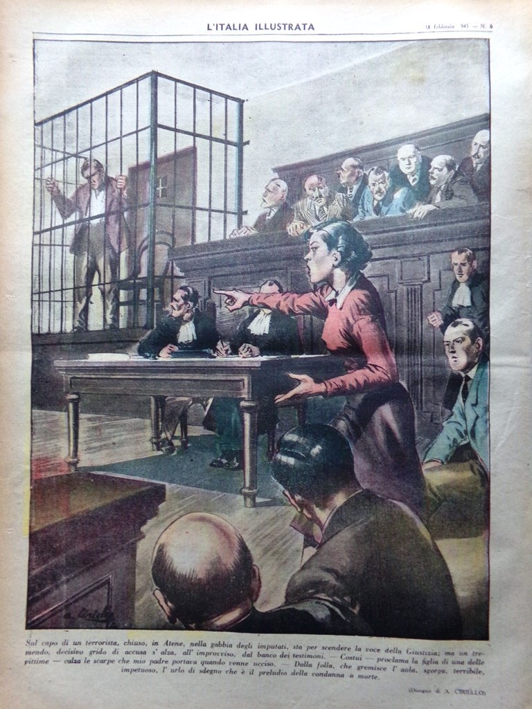 Sul capo di un terrorista, chiuso, in Atene, nella gabbia degli imputati, sta per scendere la voce della Giustizia; ma un tremendo, decisivo grido di accusa s'alza all'improvviso, dal banco dei testimoni. Costui, proclama la figlia di una delle vittime, calza le scarpe che mio padre portava quando venne ucciso. Dalla folla, che gremisce l'aula, sgorga, terribile, impetuoso, l'urlo di sdegno che è il preludio della condanna a morte (disegno di A. Ciriello)