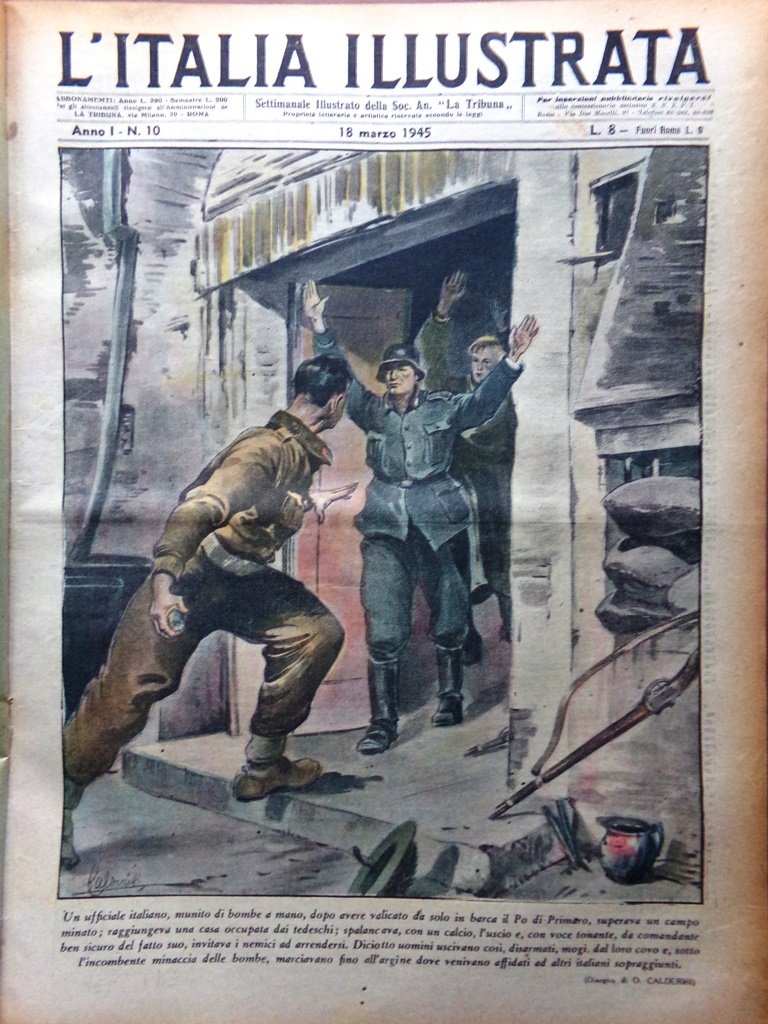 Un ufficiale italiano, munito di bombe a mano, dopo avere valicato da solo in barca il Po di Primaro, superava un campo minato; raggiungeva una casa occupata dai tedeschi; spalancava, con un calcio l'uscio e con voce tonante, da comandante ben sicuro del fatto suo, invitava i nemici ad arrendersi. Diciotto uomini uscivano così, disarmati, mogi, dal loro covo e, sotto l'incombente minaccia delle bombe, marciavano fino all'argine dove venivano affidati ad altri italiani sopraggiunti (disegno di O. Calderisi)