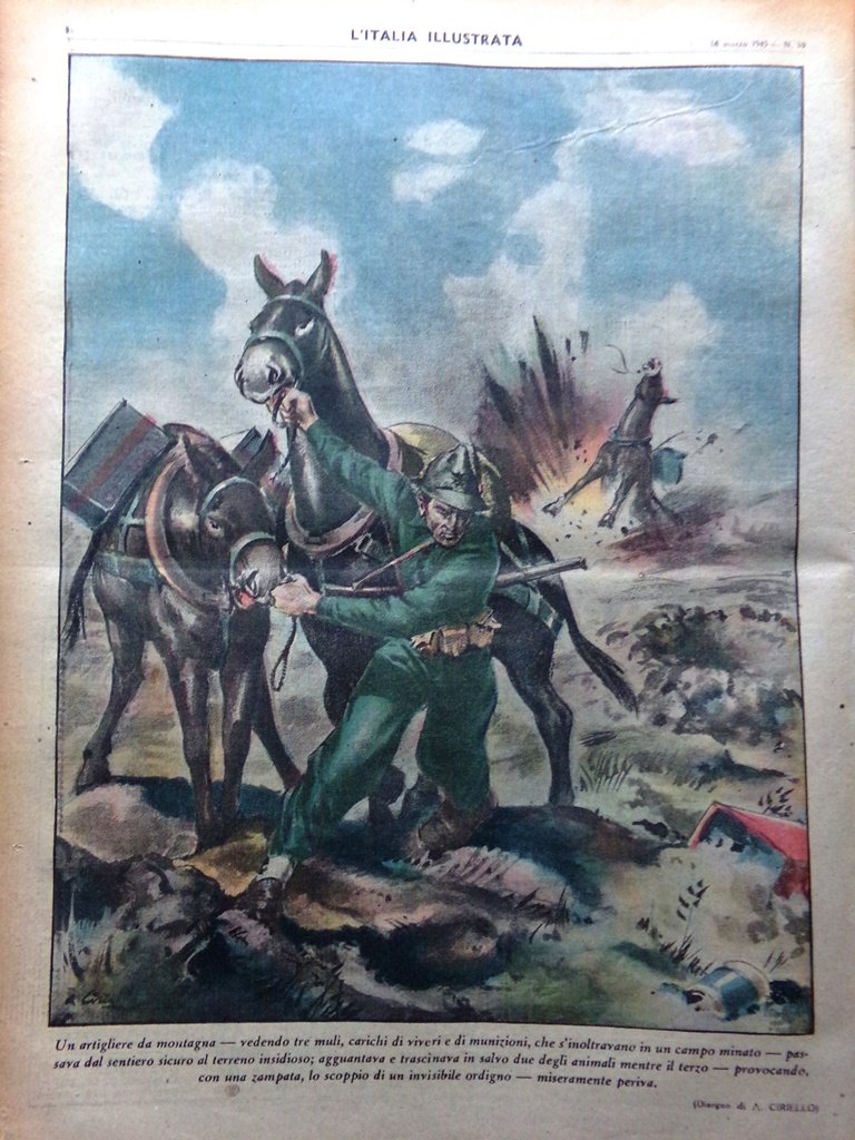 Un artigliere da montagna, vedendo tre muli carichi di viveri e di munizioni che s'inoltravano in un campo minato, passava dal sentiero sicuro al sentiero insidioso; agguantava e trascinava in salvo due degli animali mentre il terzo, provocando con una zampata lo scoppio di un invisibile ordigno, miseramente periva (disegno di A. Ciriello)