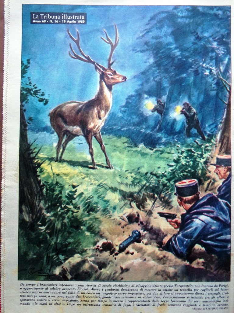 Da tempo i bracconieri infestavano una riserva di caccia ricchissima di selvaggina situata presso Turquestein, non lontano da Parigi, e appartenente al celebre avvocato Floriot. Allora i gendarmi decidevano di mettere in azione un tranello per coglierli sul fatto: collocarono in una radura nel folto di un bosco un magnifico cervo impagliato, poi due di loro si appostarono dietro i cespugli. L'attesa non fu vana; a un certo punto due bracconieri, giunti nelle vicinanze in automobile, s'avvicinavano strisciando tra gli alberi e sparavano contro il cervo impagliato. Senza por tempo in mezzo i rappresentanti della legge balzavano dal loro nascondiglio intimando "le mani in alto!". Dopo un infruttuoso tentativo di fuga, i cacciatori di frode venivano raggiunti e tratti in arresto (disegno di Vittorio Pisani)