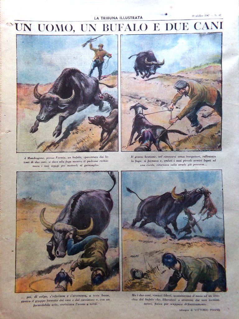 Un uomo, un bufalo e due cani (disegno in quattro vignette di Vittorio Pisani)