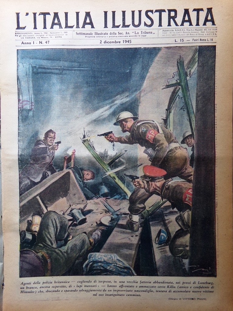 Agenti della polizia britannica, cogliendo di sorpresa in una vecchia fattoria abbandonata, nei pressi di Luneburg, un branco ancora superstite di "lupi mannari" hanno affrontato e ammazzato certo Killin (amico e confidente di Himmler) che, sbucando e sparando selvaggiamente da un improvviso nascondiglio, tentavad i accumulare nuove vittime sul suo insanguinato cammino (disegno di Vittorio Pisani)
