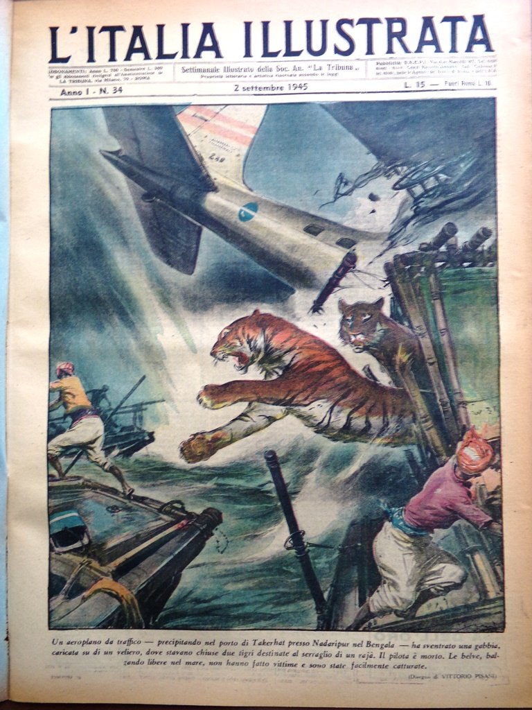Un aeroplano da traffico, precipitando nel porto di Takerhat presso Nadaripur nel Bengala, ha sventrato una gabbia, caricata su di un veliero, dove stavano chiuse due tigri destinate al serraglio di un rajà. Il pilota è morto. Le belve, balzando libere nel mare, non hanno fatto vittime e sono state facilmente catturate (disegno di Vittorio Pisani)