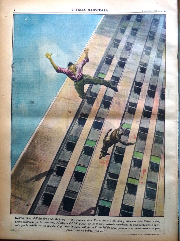 Dall'86° piano dell'Empire State Building, che domina New York; che è il più alto grattacielo della Terra e che, poche settimane fa fu sventrato all'altezza del 79° piano da un enorme velivolo americano da bombardamento sperduto fra la nebbia, un suicida dopo aver lanciato nell'abisso il suo fedele cane, piombava al suolo dopo aver percorsi come un bolide 308 metri (disegno di Vittorio Pisani)