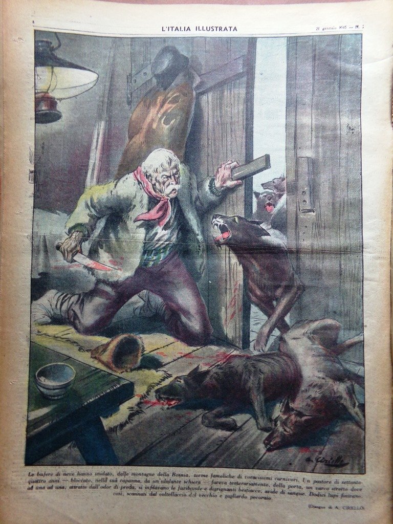 Le bufere di neve hanno snidato dalle montagne della Bosnia torme fameliche di voracissimi carnivori. Un pastore di 74 anni, bloccato nella sua capanna da un'ululante schiera, faceva temerariamente della porta un varco stretto dove ad una ad una attratte dall'odor di preda, si infilavano le furibonde e digrignanti bestiacce, avide di sangue. Dodici lupi finivano così scannati dal coltellaccio del vecchio e gagliardo pecoraio (disegno di A. Ciriello)