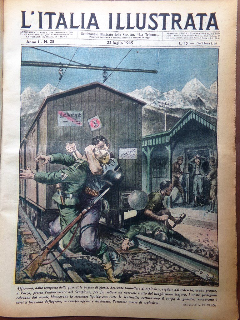Affiorano dalla tempesta della guerra, le pagine di storia. Sessanta tonnellate di esplosivo, vigilate dai tedeschi, erano pronte a Varzo presso l'imboccatura del Sempione, per far saltare un notevole tratto del lunghissimo traforo. I nostri partigiani calavano dai monti; bloccavano la stazione; liquidavano tutte le sentinelle; catturavano il corpo di guardia; vuotavano i carri e facevano deflagrare, in campo aperto e disabitato, l'enorme massa di esplosivo (disegno di A. Ciriello)