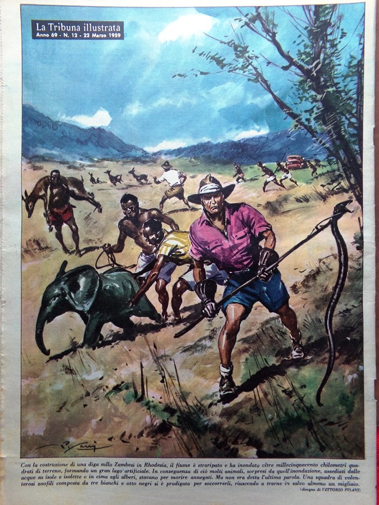 Con la costruzione di una diga sullo Zambesi in Rhodesia, il fiume è straripato e ha inondato oltre millecinquecento chilometri quadrati di terreno, formando un gran lago artificiale. In conseguenza di ciò molti animali, sorpresi da quell'inondazione, assediati dalle acque su isole e isolette o in cima agli alberi, stavano per morire annegati. Ma non era detta l'ultima parola. Una squadra di volenterosi zoofili composta da tre bianchi e otto neri si è prodigata per soccorrerli riuscendo a trarne in salvo almeno un migliaio (disegno di Vittorio Pisani)