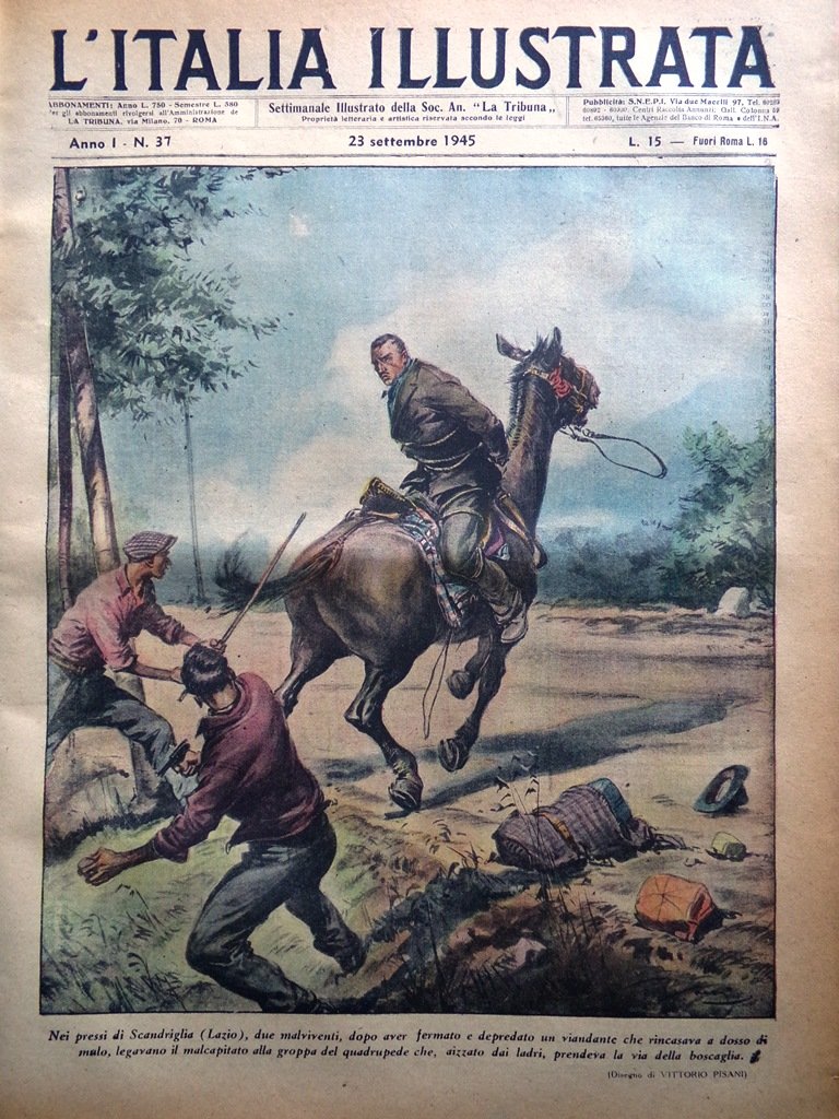 Nei pressi di Scandriglia (Lazio), due malviventi, dopo aver fermato e depredato un viandante che rincasava a dosso di mulo, legavano il malcapitato alla groppa del quadrupede che, aizzato dai ladri, prendeva la via della boscaglia (disegno di Vittorio Pisani)
