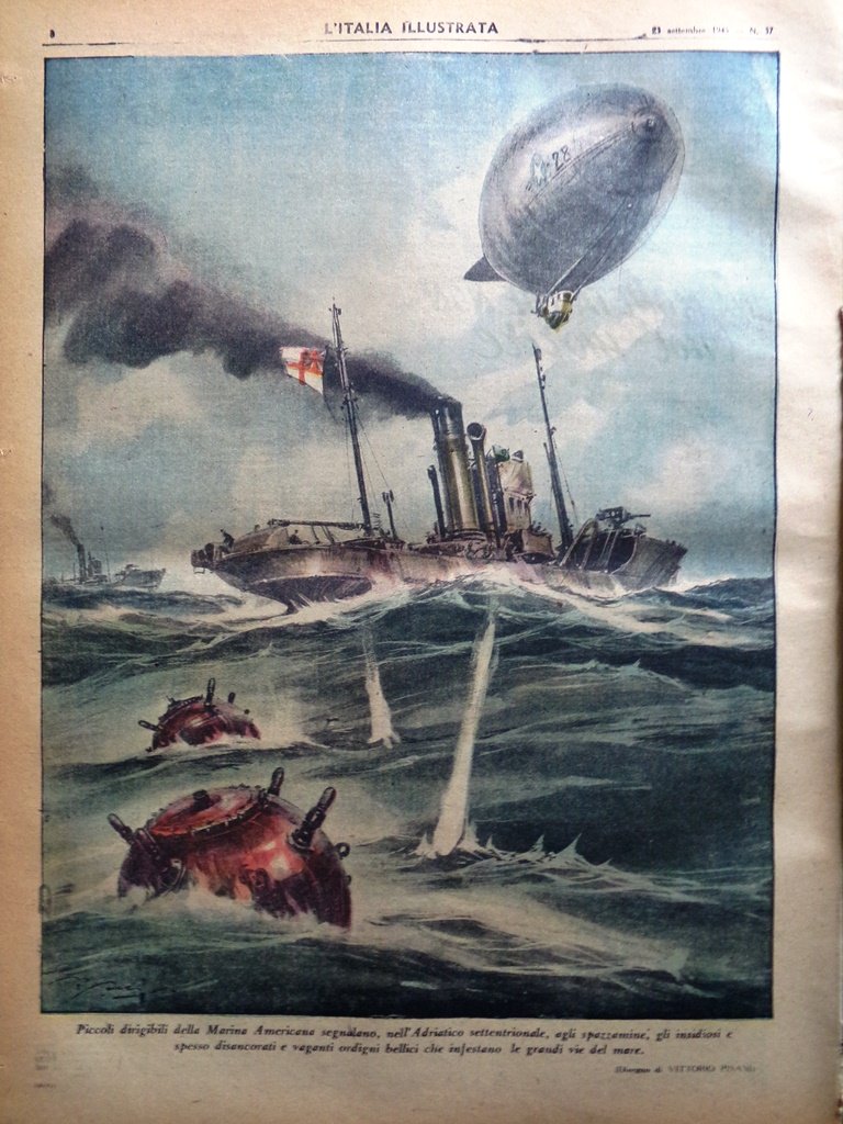Piccoli dirigibili della Marina Americana segnalano nell'Adriatico settentrionale agli spazzamine, gli insidiosi e spesso disancorati e vaganti ordigni bellici che infestano le grandi vie del mare (disegno di Vittorio Pisani)