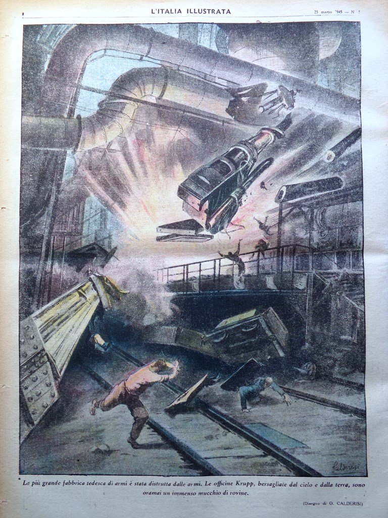 La più grande fabbrica tedesca di armi è stata ditrutta dalle armi. Le officine Krupp, bersagliate dal cielo e dalla terra, sono oramai un immenso mucchio di rovine (disegno di O. Calderisi)