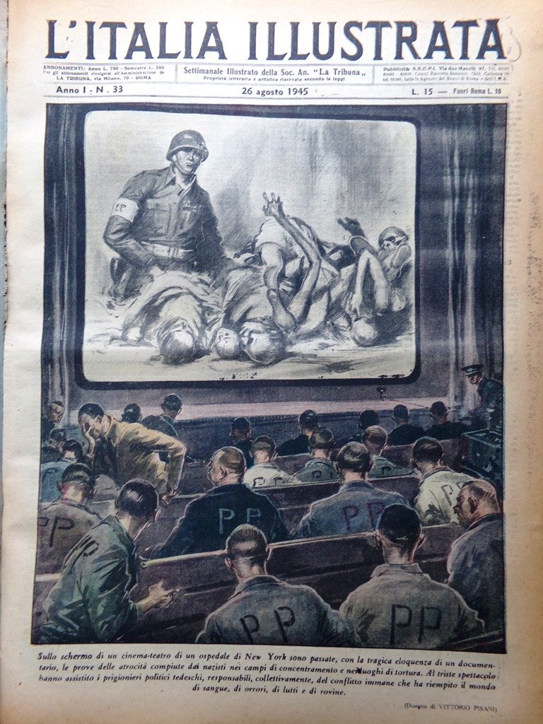 Sullo schermo di un cinema-teatro di un ospedale di New York sono passate, con la tragica eloquenza di un documentario, le prove delle atrocità compiute dai nazisti nei campi di concentramento e nei luoghi di tortura. Al triste spettacolo hanno assistito i prigionieri politici tedeschi, responsabili, collettivamente, del conflitto immane che ha riempito il mondo di sangue, di orrori, di lutti e di rovine (disegno di Vittorio Pisani)