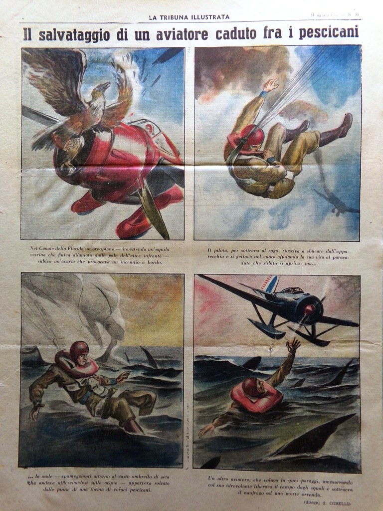 Il salvataggio di un aviatore caduto fra i pescicani (disegno in quattro vignette di Gibelli)