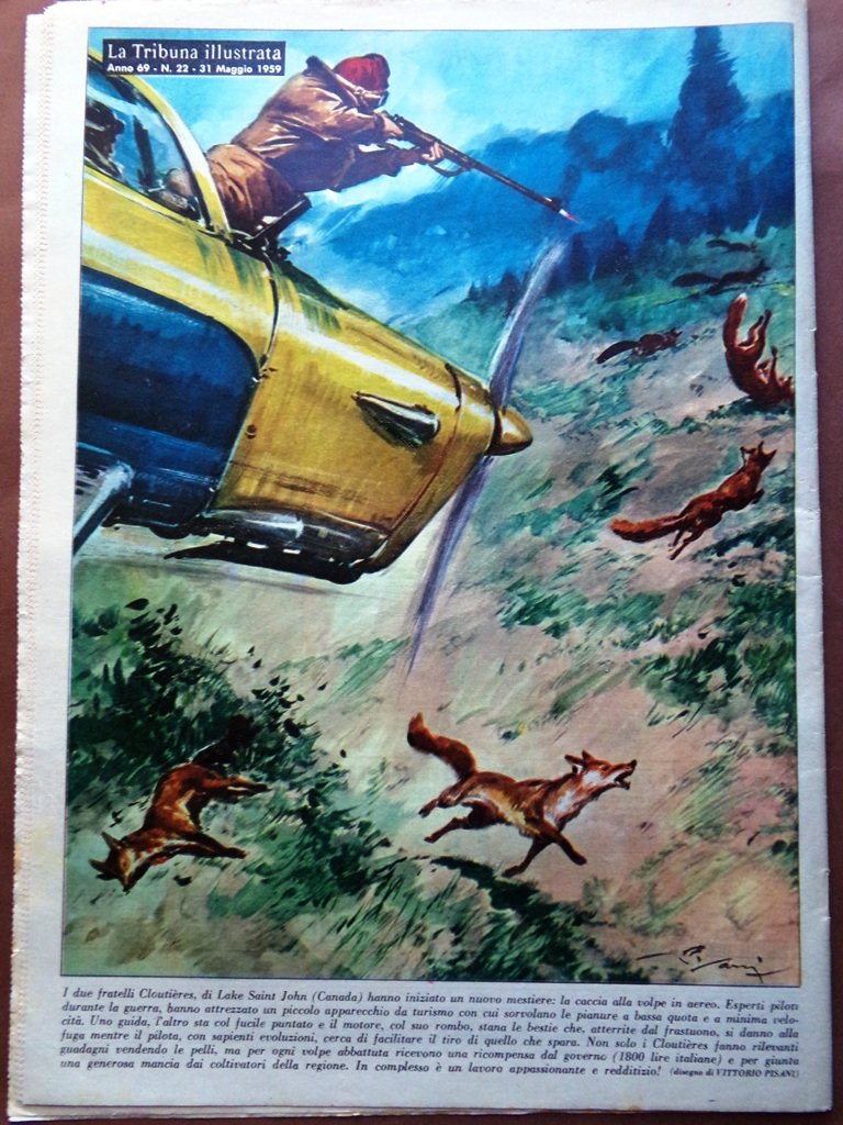 I due fratelli Cloutières, di Lake Saint John (Canada) hanno iniziato un nuovo mestiere: la caccia alla volpe in aereo. Esperti piloti durante la guerra, hanno attrezzato un piccolo apparecchio da turismo con cui sorvolano le pianure a bassa quota e a minima velocità. Uno guida, l'altro sta col fucile puntato e il motore, col suo rombo, stana le bestiee che, atterrite dal frastuono, si danno alla fuga mentre il pilota, con sapienti evoluzioni, cerca di facilitare il tiro di quello che spara. Non solo i Cloutières fanno rilevanti guadangi vendendo le pelli, ma per ogni volpe abbattuta ricevono una ricompensa dal governo (1800 lire italiane) e per giunta una generosa mancia dai coltivatori della reigone. In complesso è un lavoro appassionante e redditizio! (disegno di Vittorio Pisani)