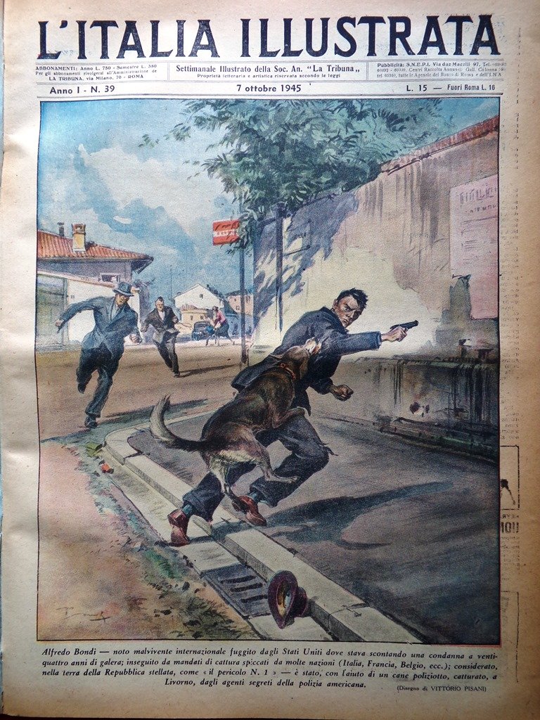 Alfredo Bondi, noto malvivente internazionale fuggito dagli Stati Uniti dove stava scontando una condanna a ventiquattro anni di galera; inseguito da mandati di cattura spiccati da molte nazioni (Italia, Francia, Belgio, ecc.); considerato, nella terra della Repubblica stellata come il "pericolo nr. 1" è stato, con l'aiuto di un cane poliziotto, catturato a Livorno, dagli agenti segreti della polizia americana (disegno di Vittorio Pisani)