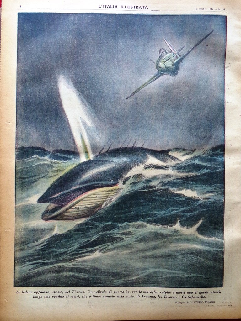Le balene appaiono, spesso, nel Tirreno. Un velivolo di guerra ha, con la mitraglia, colpito a morte uno di questi cetacei, lungo una ventina di metri che è finito arenato sulla costa di Toscana fra Livorno e Castiglioncello (disegno di Vittorio Pisani)