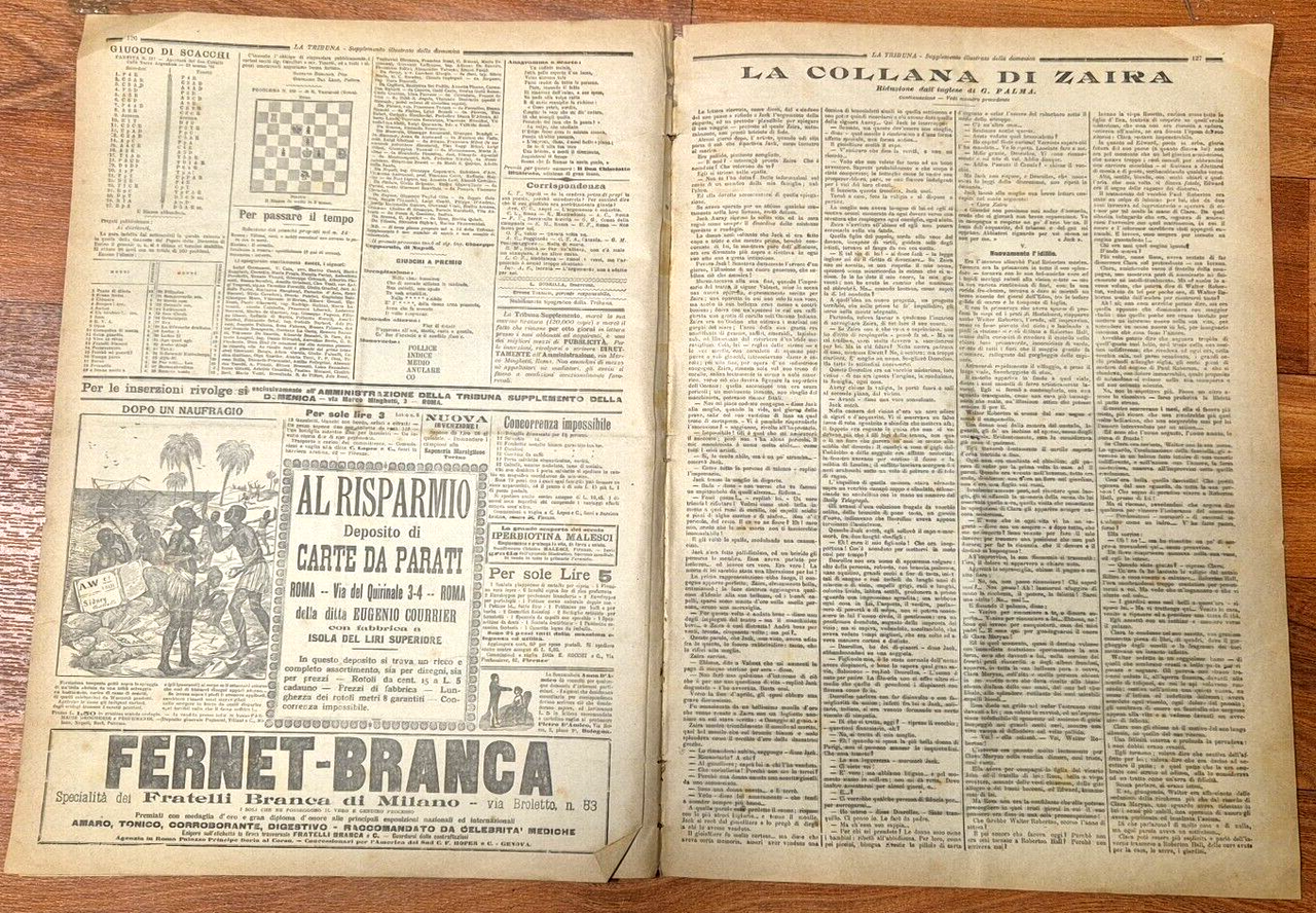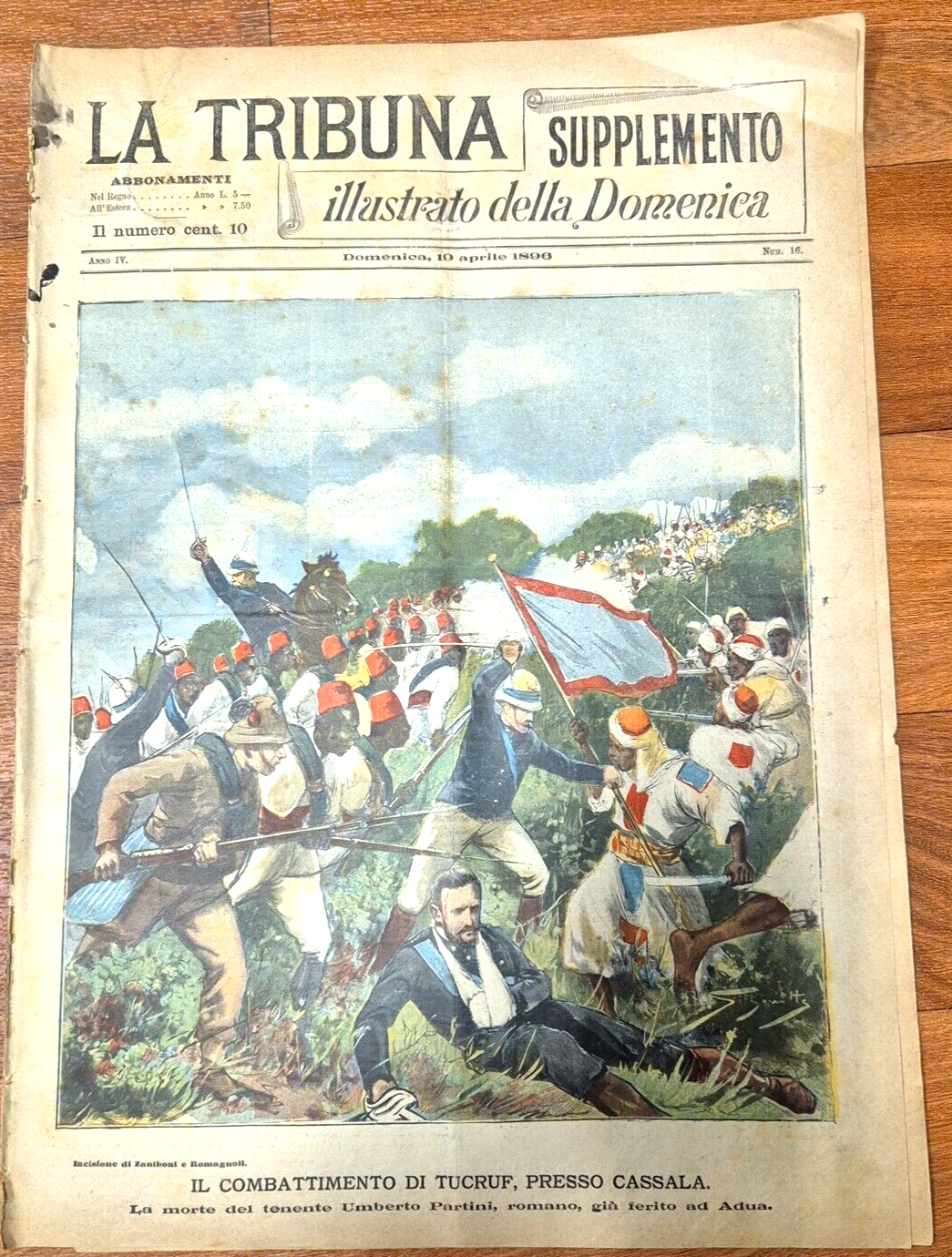 Supplemento del giornale la tribuna. 8 pagine compresa la copertina in carta con due belle illustrazioni a colori: in prima pagina il combattimento di Tucruf presso Cassala, la morte del tenente Umberto Partini. in ultima pagina: Il convegno dei sovrani a Venezia. Nel bacino di San Marco. Stato di conservazione: molto buono (pagine normalmente ingiallite, piccole macchie d'inchiostro ai margini) Giornale Antico illustrato