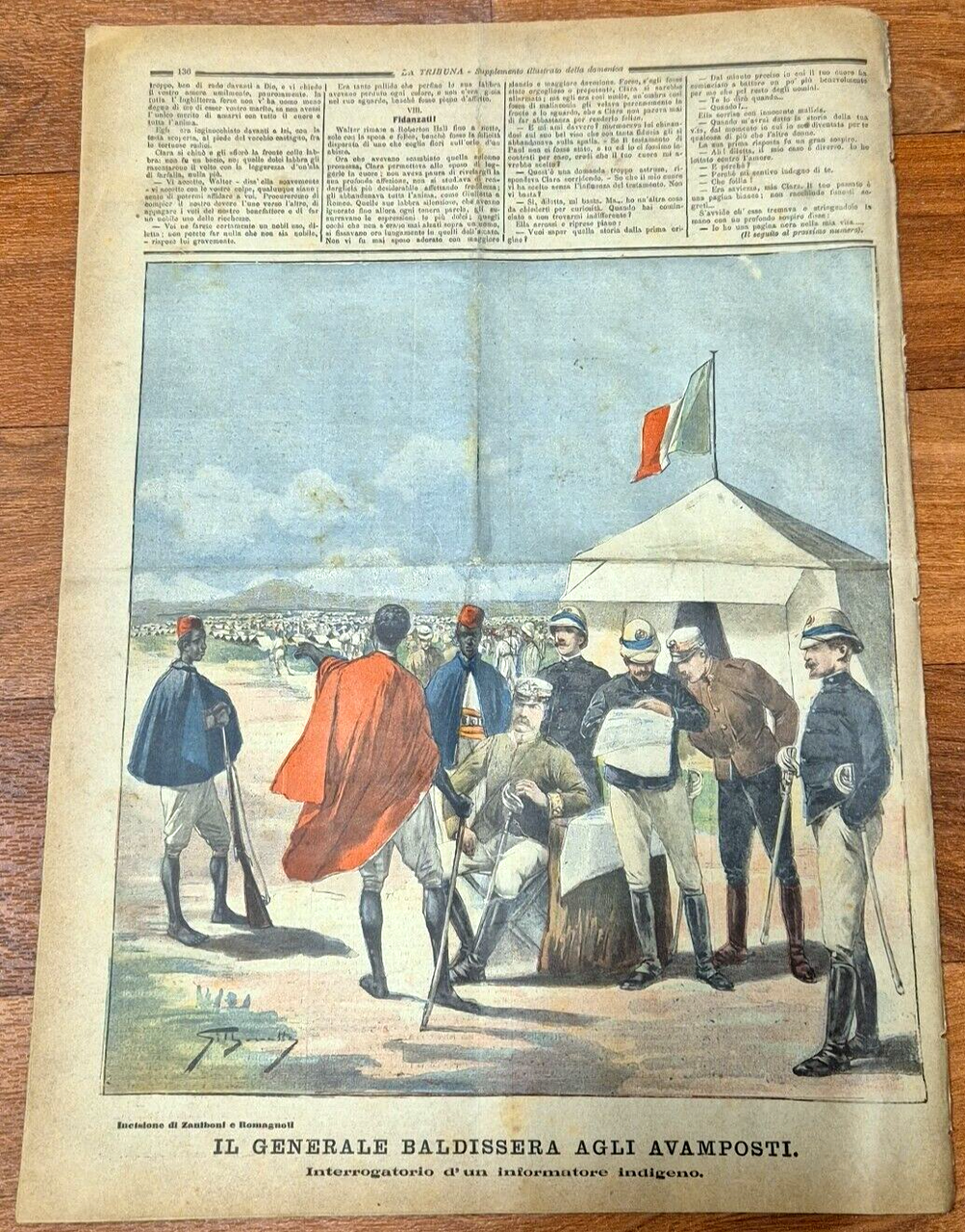 Supplemento del giornale la tribuna. 8 pagine compresa la copertina in carta con due belle illustrazioni a colori: in prima pagina "episodi africani i borghesi usciti da Adigrat ricattati e spogliati dalle bande di Ras Sebath", all'ultima pagina: Il Generale Baldissera agli avamposti. Stato di conservazione: molto buono (pagine normalmente ingiallite) Giornale Antico illustrato