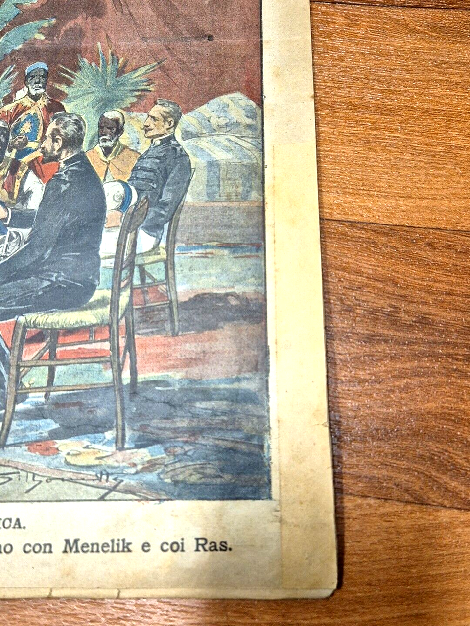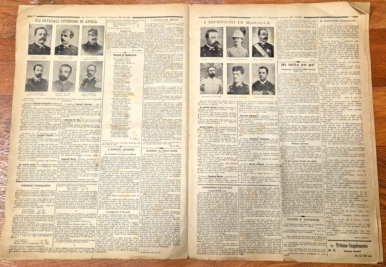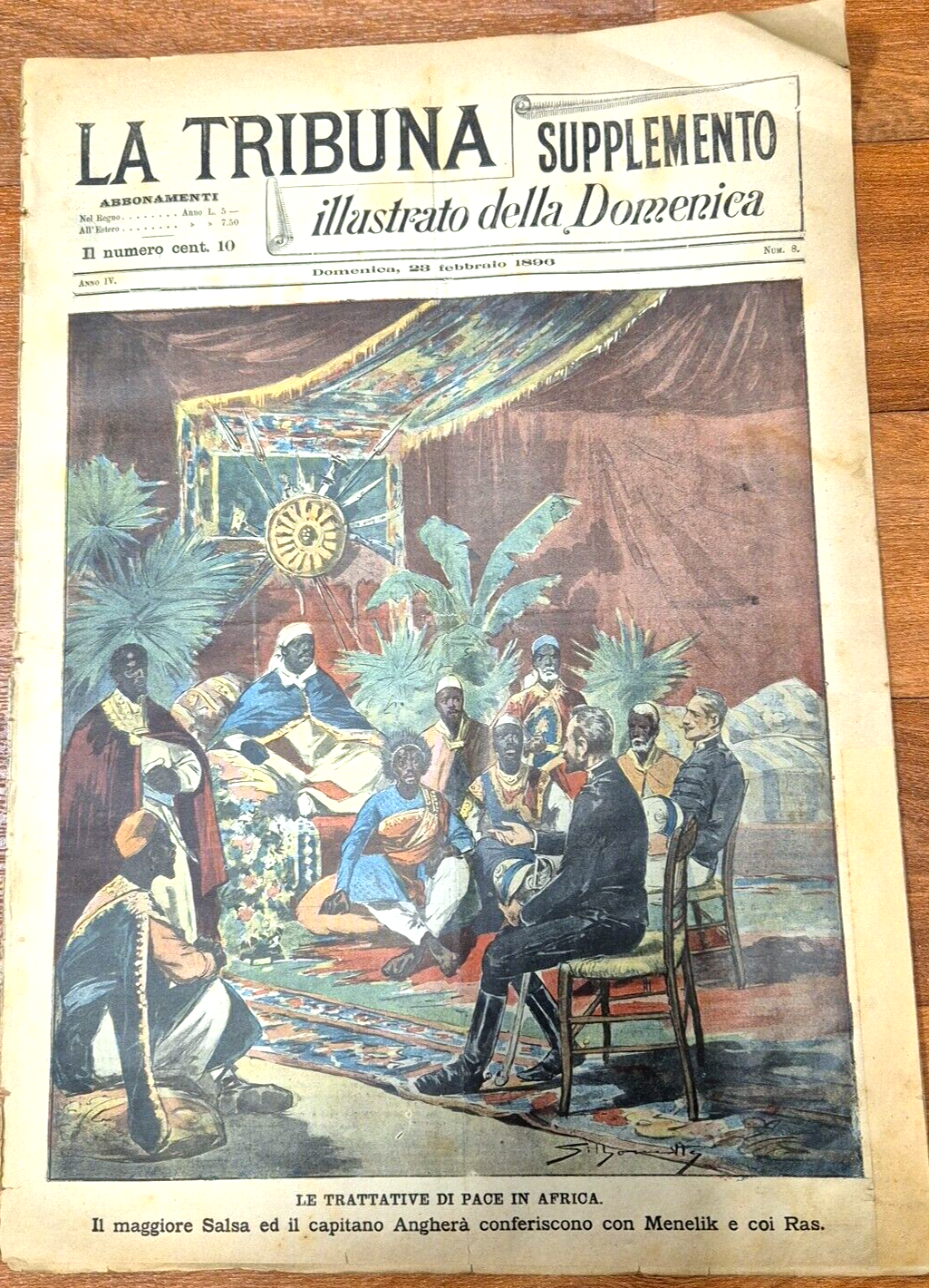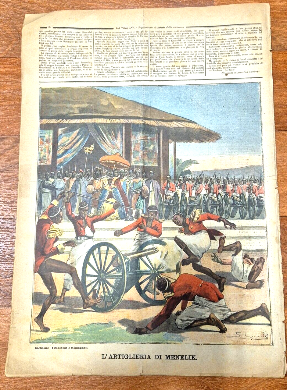 Supplemento del giornale la tribuna. 8 pagine compresa la copertina in carta con due belle illustrazioni a colori. In prima pagina: le trattative di pace in Africa. Il maggiore Salsa ed il capitano Angherà conferiscono con Menelik e coi ras. In ultima pagina: L'artiglieria di Menelik. Stato di conservazione: buono (pagine normalmente ingiallite, pieghe varie, piccolo restauro antico al margine esterno della prima pagina) Giornale Antico illustrato