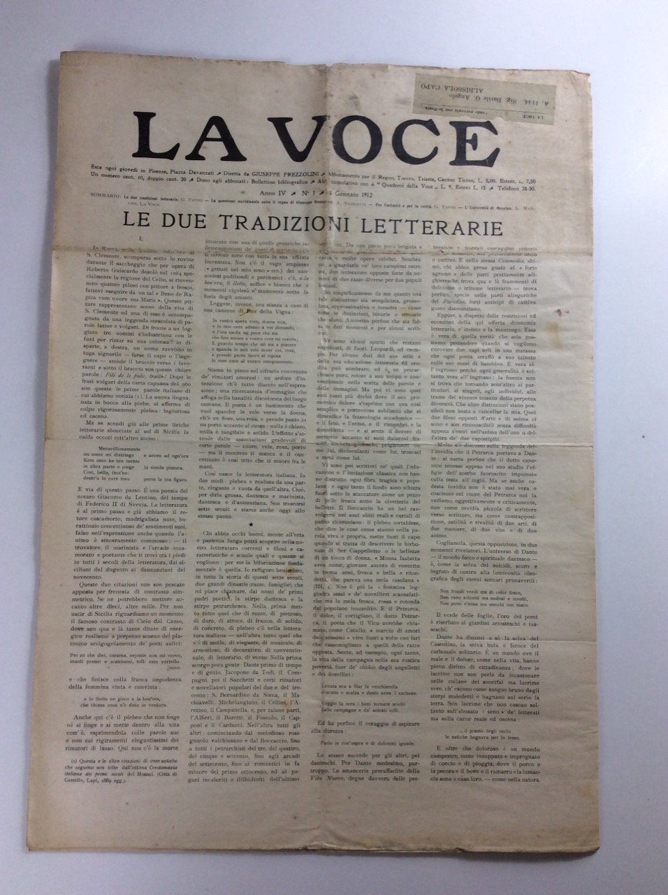 In folio, brossura.Rivista settimanale fondata a Firenze da Giuseppe Prezzolini il 20 dicembre 1908, di straordinaria importanza per la vita e la cultura italiana.