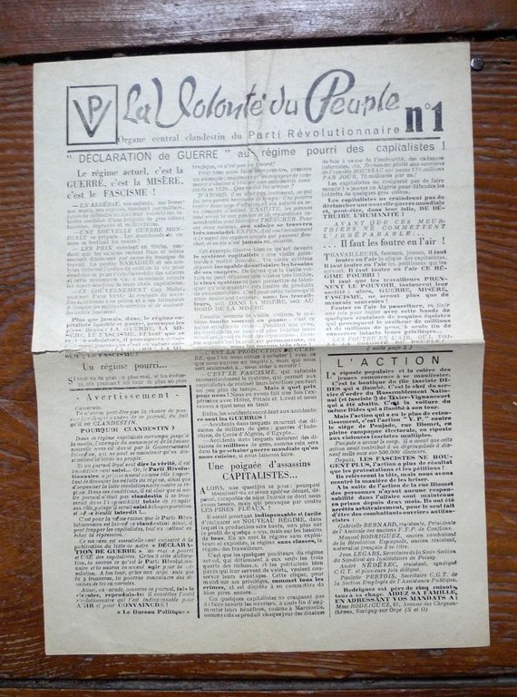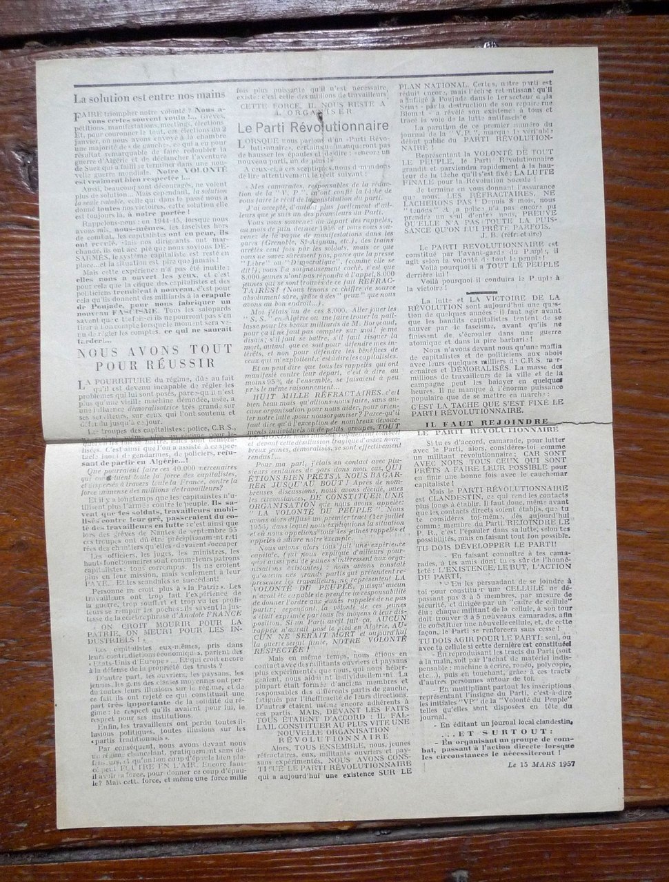 LA VOLONTÈ DU PEUPLE n.1Organe central clandestin du PARTI RÉVOLUTIONNAIRE,Paris, le 15 mars 1957,30x22 cm., pp.2testo in francese,peso: g.300cod.10054CONDIZIONI DEL PERIODICO: discrete,piega centrale,strappetto senza mancanze in corrispondenza della piega,pagine ingiallite