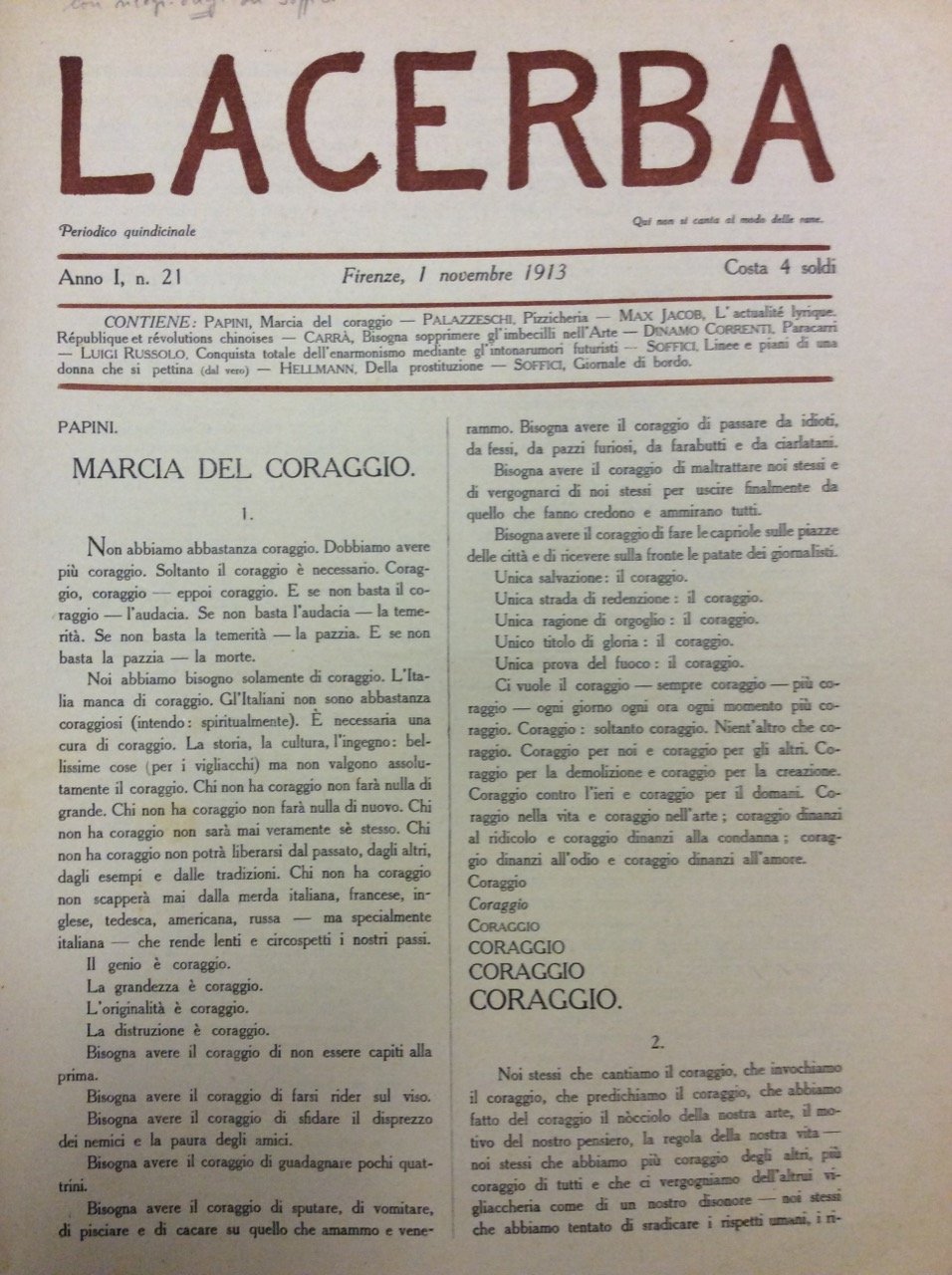 Fascicolo in-4 gr. (mm. 350x252), brossura, pp. 12, con 1 xilografia originale di Ardengo Soffici, a piena pagina nel testo - Piani e linee di una donna che si pettina (dal vero). Contiene testi di: PAPINI, Marcia del coraggio - PALAZZESCHI, Pizzicheria - MAX JACOB, L'actualité lyrique. République et révolution chinoises - DINAMO CORRENTI, Paracarri - RUSSOLO, Conquista totale dell'enarmonismo mediante gl'intonarumori futuristi - HELLMANN, Della prostituzione - SOFFICI, Giornale di bordo - CARRA', Bisogna sopprimere gl'imbecilli nell'Arte (manifesto in prima edizione). Cfr. Tonini, I manifesti del Futurismo italiano, 67.1 - Bartolini, Ardengo Soffici. L'opera incisa, pag. 151, tav. XXXV (per la xilografia). Picc. strappetti marginali, altrimenti esemplare ben conservato.