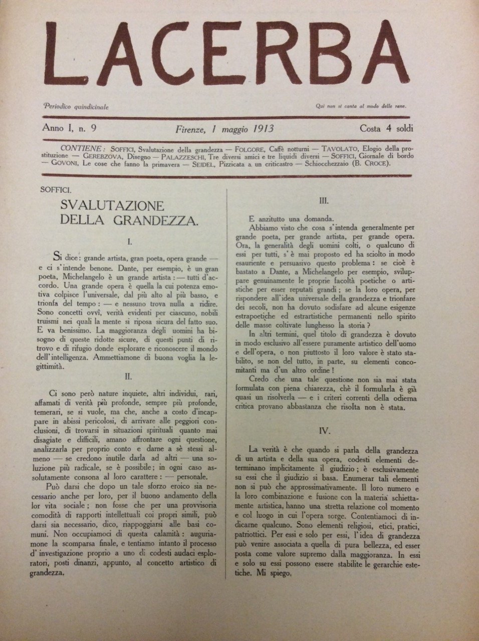 LACERBA. ANNO I - N. 9, 1 MAGGIO 1913. - Periodico quindicinale. Qui non si canta al modo delle rane. Guido Pogni, gerente responsabile.