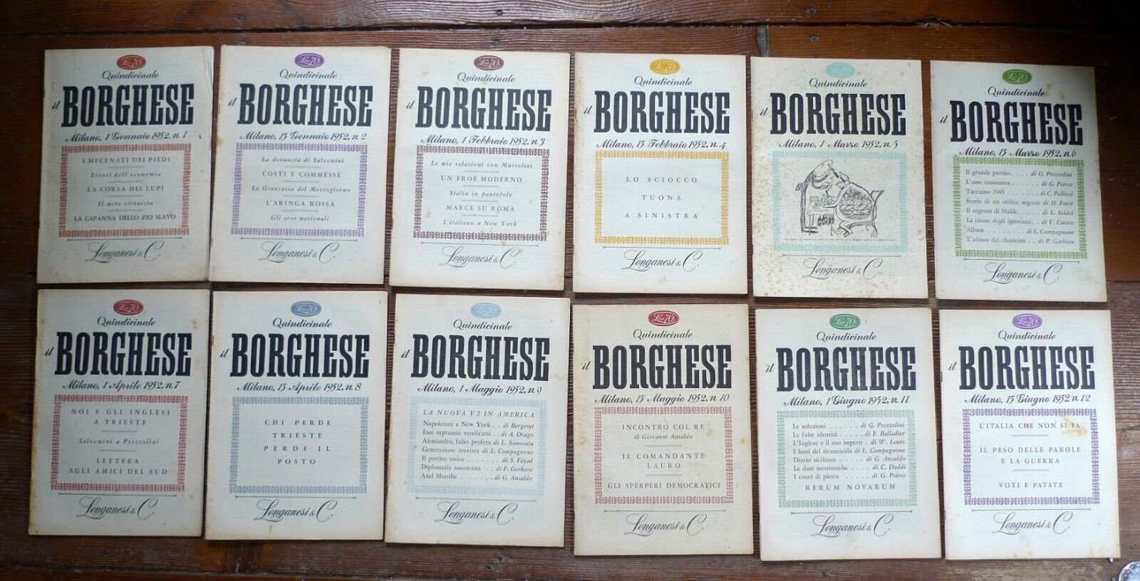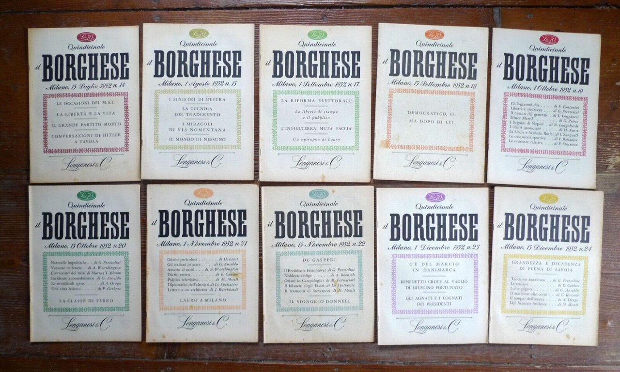 QUINDICINALE IL BORGHESE.Direttore responsabile LEO LONGANESI.nn.1/24 1952[22 NUMERI, MANCANO I NUMERI 13 e 16]Longanesi & C., Milano 1952,brossura, rilegatura con punto metallico,30,5x21,5 cm., pp.32 ciascun fascicolo,illustrazioni in bianco e nero,peso: kg.1,6cod.9212CONDIZIONI DELLE RIVISTE: buone,imperfezioni alle copertine,sporadiche fioriture