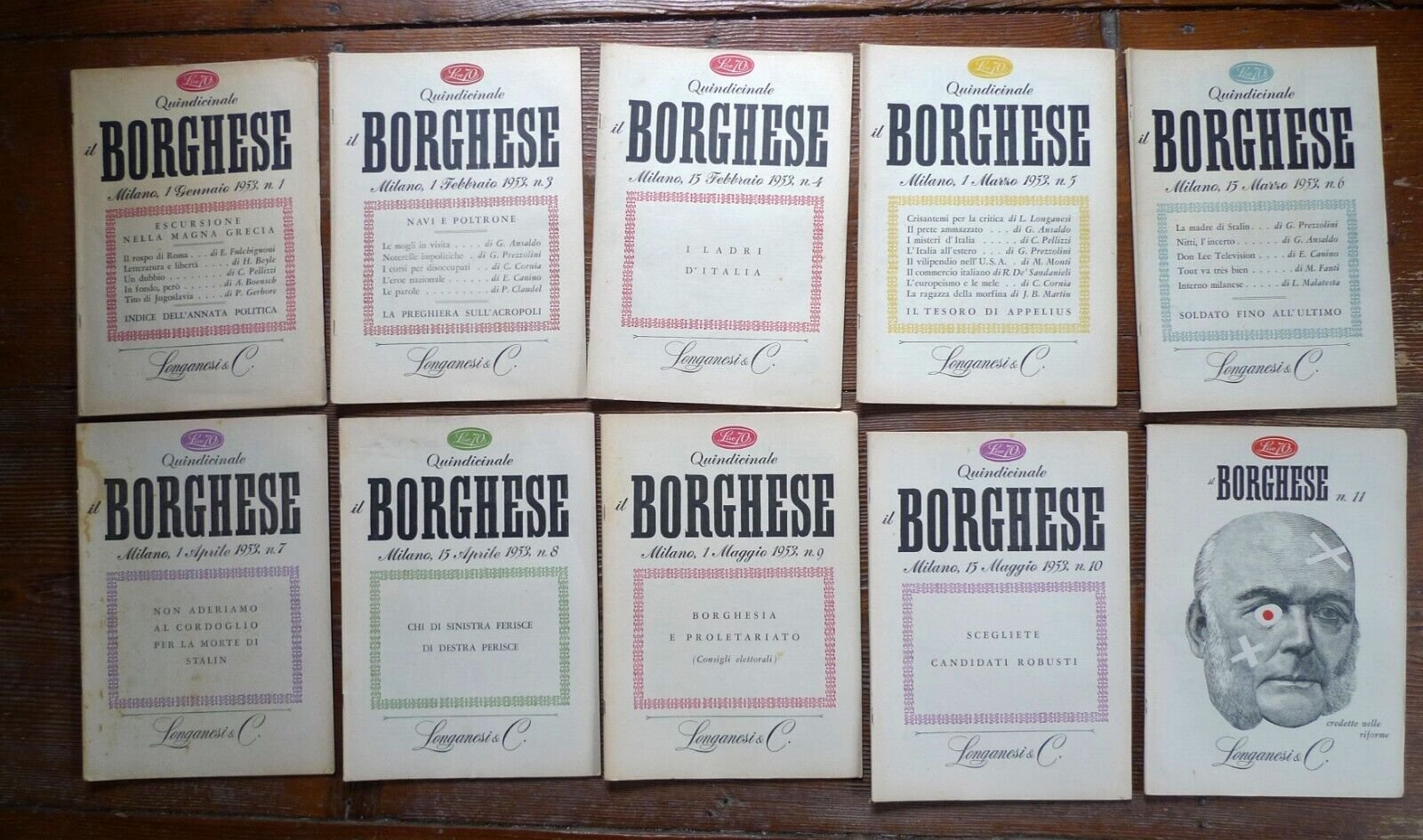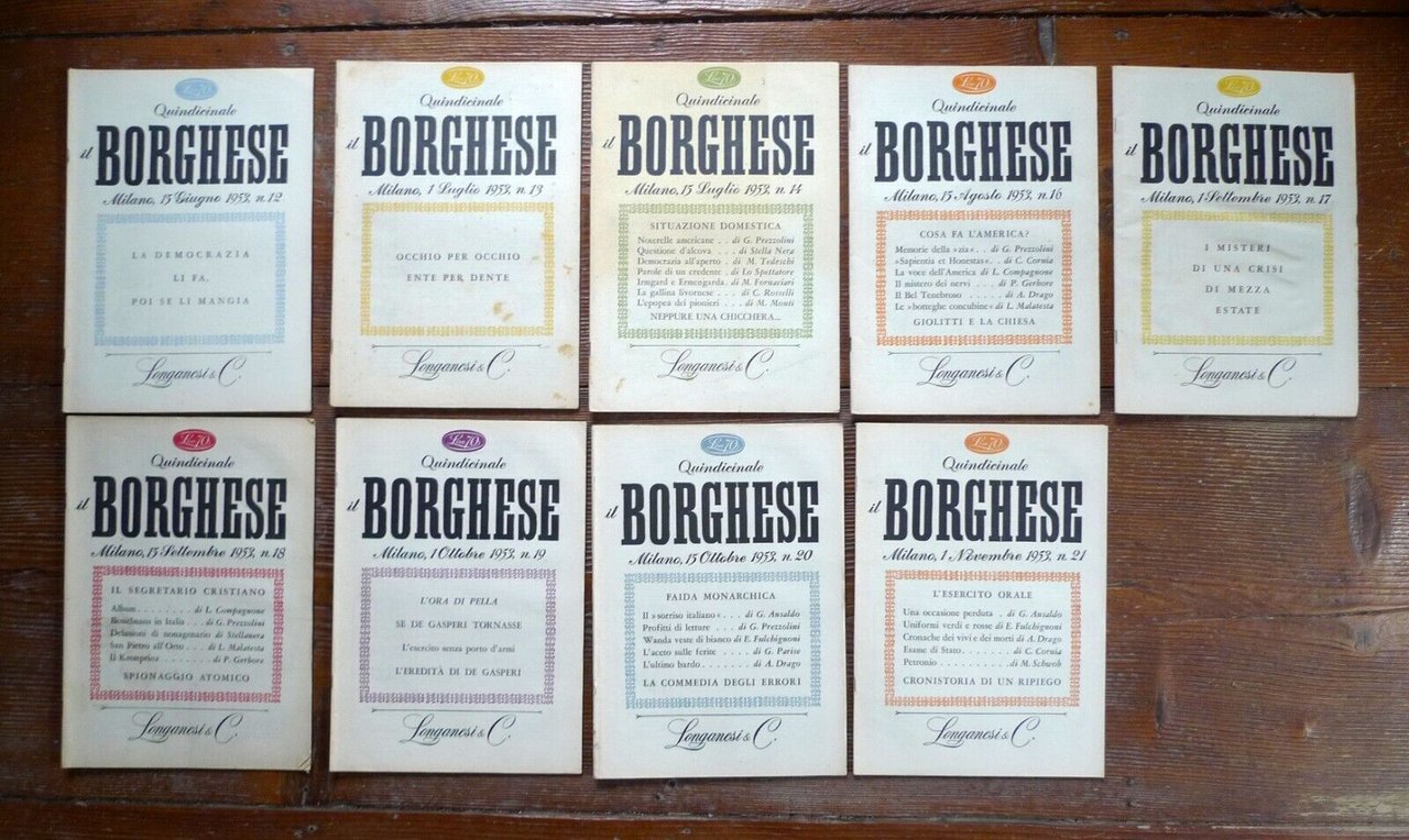 QUINDICINALE IL BORGHESE.Direttore responsabile LEO LONGANESI.nn.1/24 1953[19 NUMERI, MANCANO I NUMERI 2/15/22/23/24]Longanesi & C., Milano 1953,brossura, rilegatura con punto metallico,30,5x21,5 cm., pp.32 ciascun fascicolo,illustrazioni in bianco e nero,peso: kg.1,5cod.9212CONDIZIONI DELLE RIVISTE: buone,imperfezioni alle copertine,sporadiche fioriture
