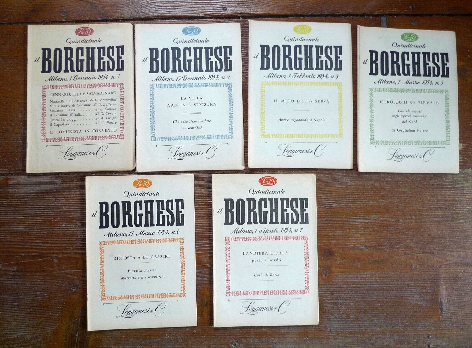QUINDICINALE IL BORGHESE.Direttore responsabile LEO LONGANESI.nn.1/2/3/5/6/7 1954.Longanesi & C., Milano 1954,brossura, rilegatura con punto metallico,30,5x21,5 cm., pp.32 ciascun fascicolo,illustrazioni in bianco e nero,peso: g.500cod.9212CONDIZIONI DELLE RIVISTE: buone,imperfezioni alle copertine,sporadiche fioriture