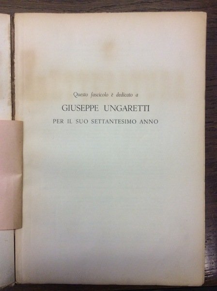 In-8 gr., brossura orig. Di questo celebrato periodico offriamo il fascicolo n. 35-36, settembre-dicembre 1958, di pp. 371, con 8 tavole in bianco e nero fuori testo (recto/verso), interamente dedicato a Giuseppe UNGARETTI, per il suo settantesimo anno. Vi sono contenuti: una poesia e "Quaderno egiziano" (di Ungaretti), numerosiss. saggi, testimonianze e uno zibaldone dei più importanti autori italiani.Esemplare ben conservato.