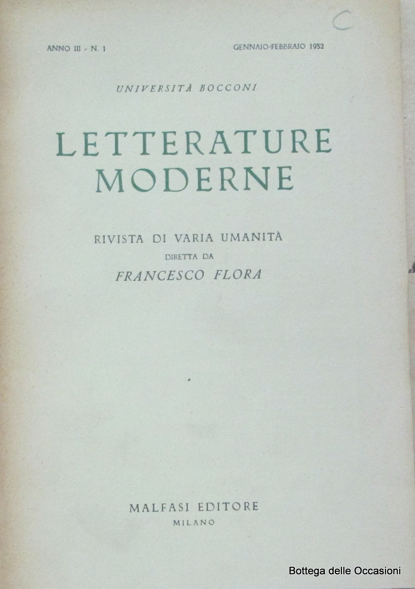 In-8, 6 fascicoli, brossura editoriale (lieve manc. al dorso del n. 1), pp. compl. 750. Offriamo l'annata completa del 1952.<br>"Rivista pubblicata a Milano, a cura dell'Università Bocconi, dal 1950 al 1962, anno della morte del Flora, suo fondatore e direttore. Ha dedicato saggi e rassegne alla poesia, alla cultura e alla critica di ogni paese del presente e del passato, pubblicando articoli di personalità come Thomas Mann, Benedetto Croce, Ezra Pound". Cosi' Diz. Vallecchi,I, p. 708.Pagine leggermente ingiallite per la qualità della carta, peraltro ben conservata.