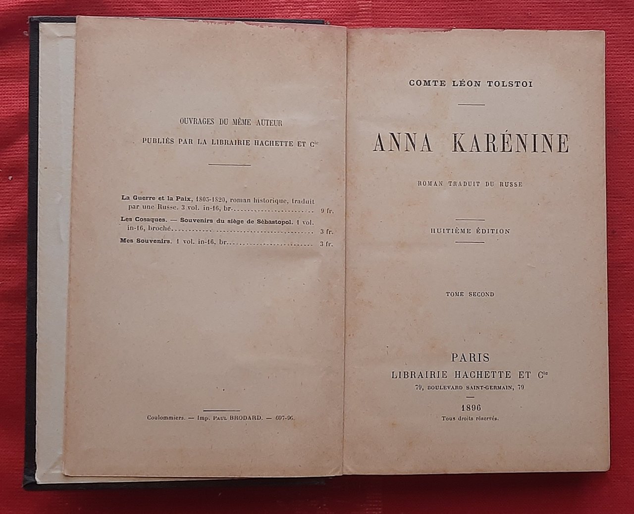 Libro Antico Originale del 1896 di Lev Tolstoj Anna Karenine Vol. 2 in Francese