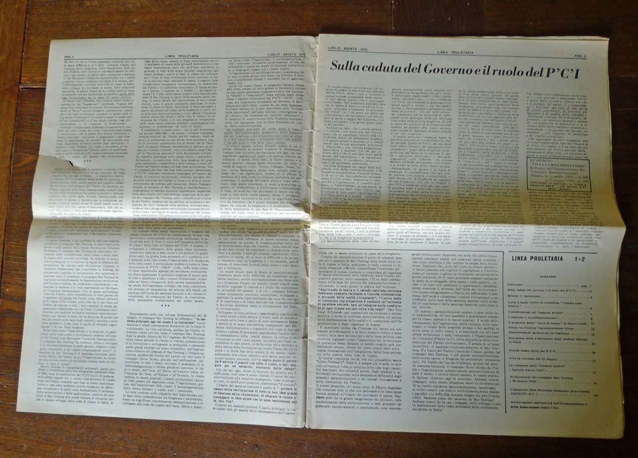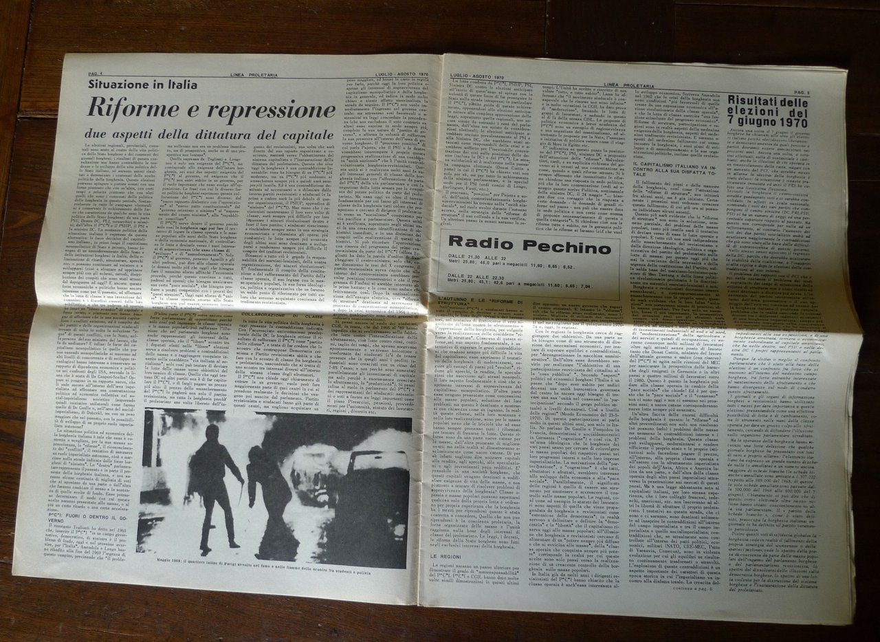 LINEA PROLETARIA n.1-2 Luglio-Agosto 1970Organo centrale dell'organizzazione deicomunisti marxisti-leninisti d'Italia.Direttore responsabile: Osvaldo Pesce.Milano 1970,44x33 cm., pp.24,illustrazioni in bianco e nero,peso: g.300cod.9830CONDIZIONI DEL PERIODICO: buone,strappo senza mancanze alla prima pagina,strappetti al dorso,piega centrale