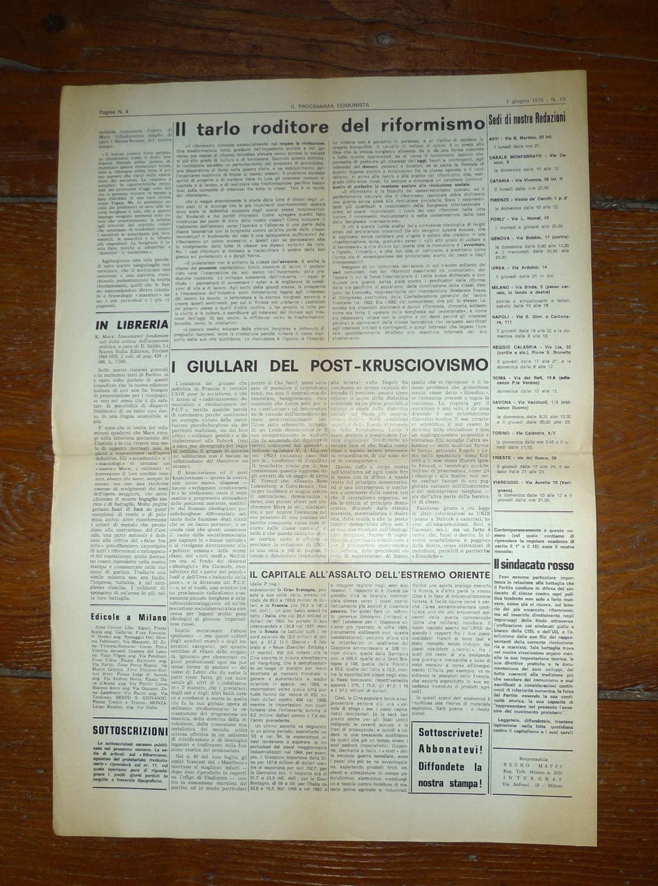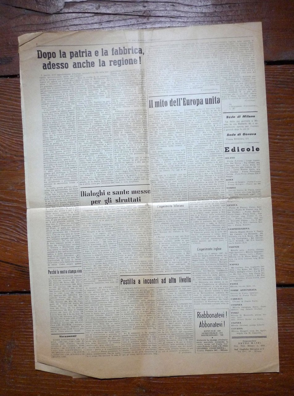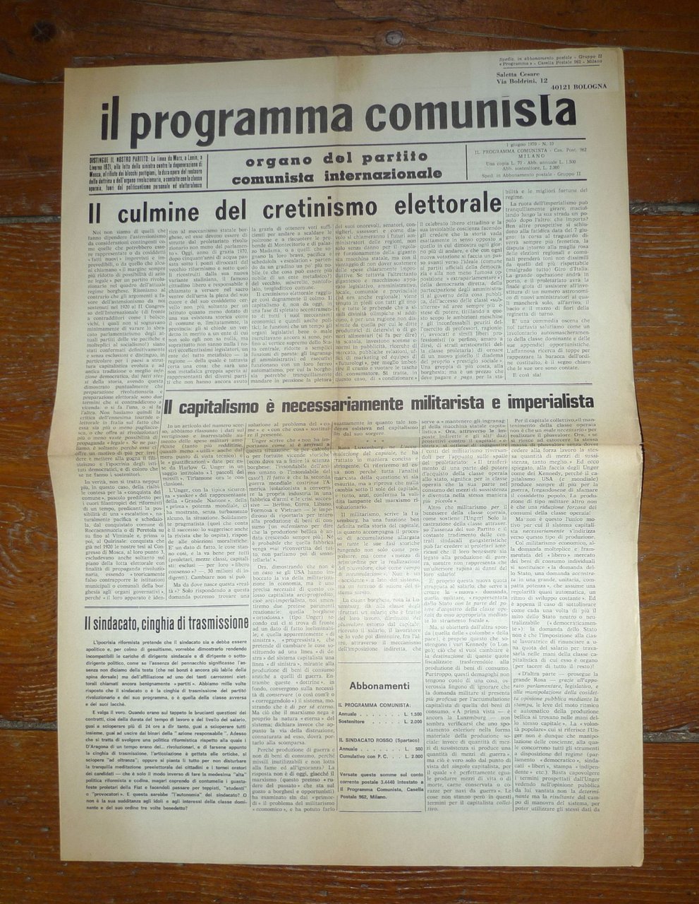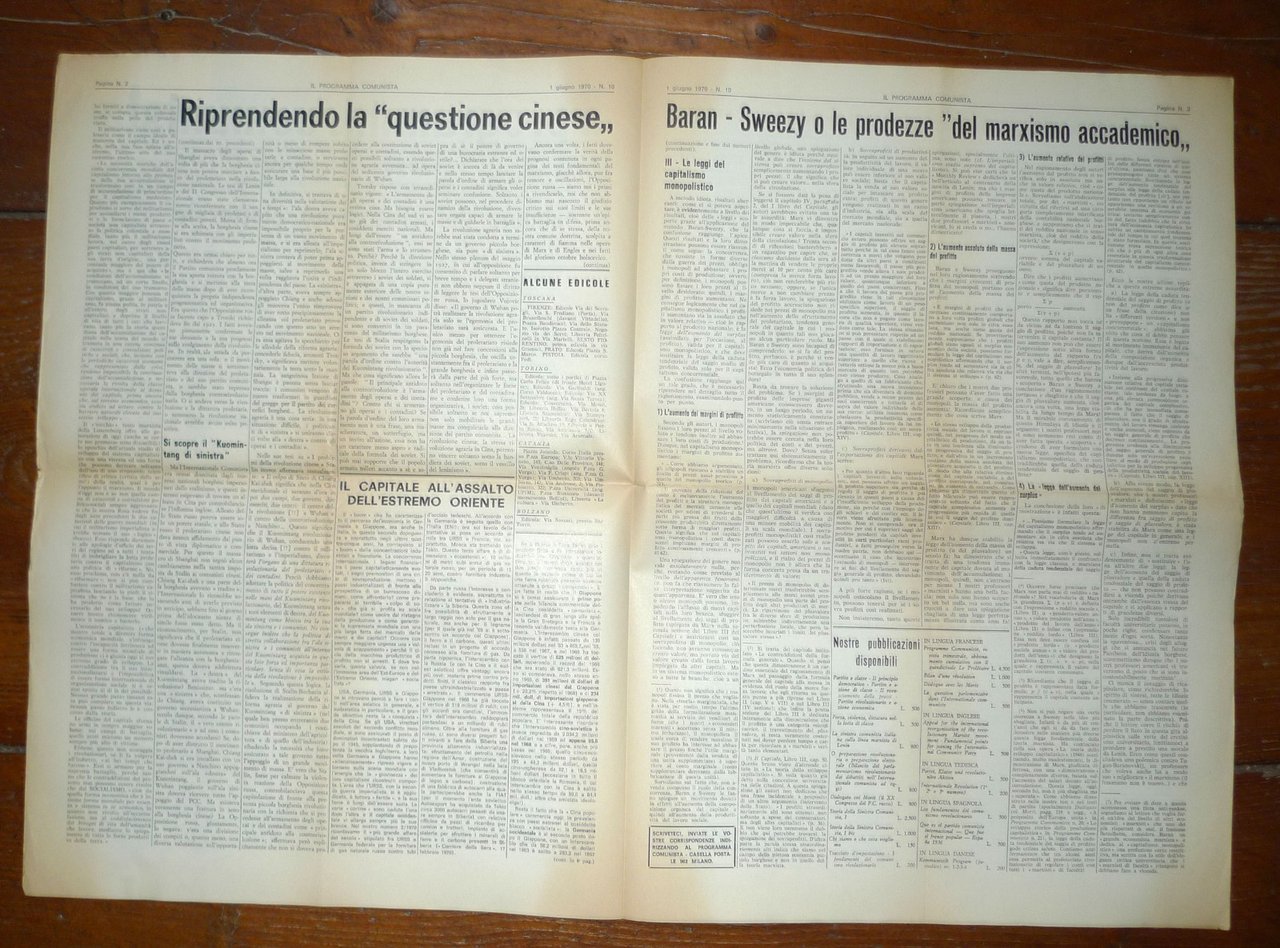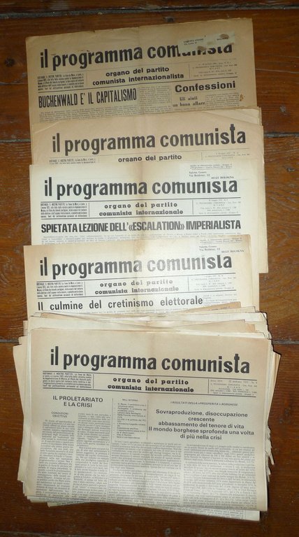 Lotto di 68 numeri deIL PROGRAMMA COMUNISTAORGANO DEL PARTITO COMUNISTA INTERNAZIONALE.Direttore responsabile: Bruno Maffi; Giusto Coppi.50x35 cm., pp.4 (raramente 6 o 8),peso: kg.2,5cod.10056CONDIZIONI DEI PERIODICI: discrete,piegati in 2 o 4,alcuni numeri possono averepagine ingiallite, bruniture estrappetti senza mancanze;nn.1/2 1960: grandi strappi senza mancanzeNUMERI COMPRESI NEL LOTTOANNO IX n.1 15-29 gennaio 1960ANNO IX n.2 28 genn.-11 febbr. 1960ANNO XI n.11 5 giugno 1962n.9 20 maggio 1970n.10 1 giugno 1970n.11 15 giugno 1970n.12 30 giugno 1970n.13 15 luglio 1970n.15 1 settembre 1970n.16 15 settembre 1970n.17 30 settembre 1970n.18 15 ottobre 1970n.19 1 novembre 1970n.20 15 novembre 1970n.21 1 dicembre 1970n.3 5 febbraio 1971n.5 1 marzo 1971n.6 15 marzo 1971n.7 1 aprile 1971n.8 12 aprile 1971n.9 26 aprile 1971n.10 10 maggio 1971n.11 24 maggio 1971n.12 7 giugno 1971n.13 21 giugno 1971n.14 5 luglio 1971n.15 19 luglio 1971n.16 2 agosto 1971n.17 30 agosto 1971n.18 13 settembre 1971n.19 27 settembre 1971n.20 11 ottobre 1971n.21 25 ottobre 1971n.22 8 novembre 1971n.23 22 novembre 1971n.24 15 dicembre 1971n.1 8 gennaio 1972n.2 22 gennaio 1972n.4 19 febbraio 1972n.5 4 marzo 1972n.6 18 marzo 1972n.8 15 aprile 1972n.9 29 aprile 1972n.10 13 maggio 1972n.11 27 maggio 1972n.12 10 giugno 1972n.13 24 giugno 1972n.16 29 agosto 1972n.17 11 settembre 1972n.18 27 settembre 1972n.19 11 ottobre 1972n.21 8 novembre 1972n.22 22 novembre 1972n.23 7 dicembre 1972n.24 21 dicembre 1972n.1 11 gennaio 1973n.2 25 gennaio 1973n.3 8 febbraio 1973n.4 22 febbraio 1973n.5 8 marzo 1973n.7 5 aprile 1973n.8 19 aprile 1973n.22 22 novembre 1973n.14 13 luglio 1974n.15 31 luglio 1974n.16 31 agosto 1974n.17 17 settembre 1974n.4 20 febbraio 1975