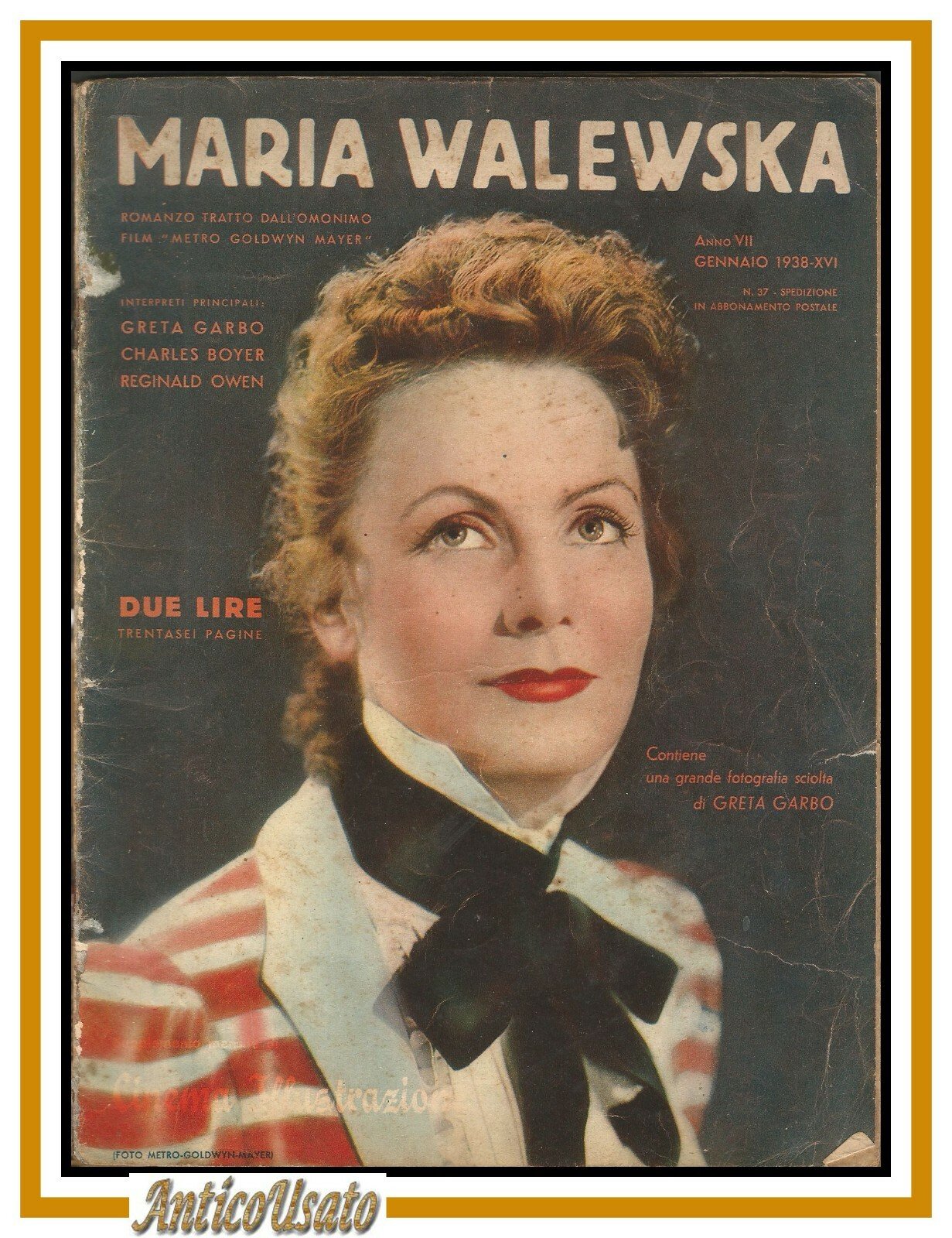 MARIA WALEWSKARomanzo tratto dall'omonimo film della Metro Goldwin Mayer, interpreti principali Greta Garbo e Charles Boyer Supplemento mensile a cinema illustrazione, Anno VII numero 37 del gennaio 1938. 34 pagine, molte foto in bianco e nero nel testo. Copertina editoriale in brossura illustrata a colori.Dimensioni: 20 x 27,5 cm. Stato di conservazione: buono (manca il dorso, spellature ai margini vicino al dorso, pagine ingiallite, manca la foto sciolta di Greta Garbo, strappetti al margine destro, esemplare proveniente da precedente rilegatura)