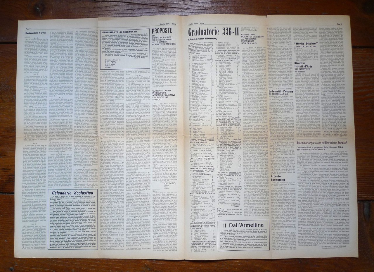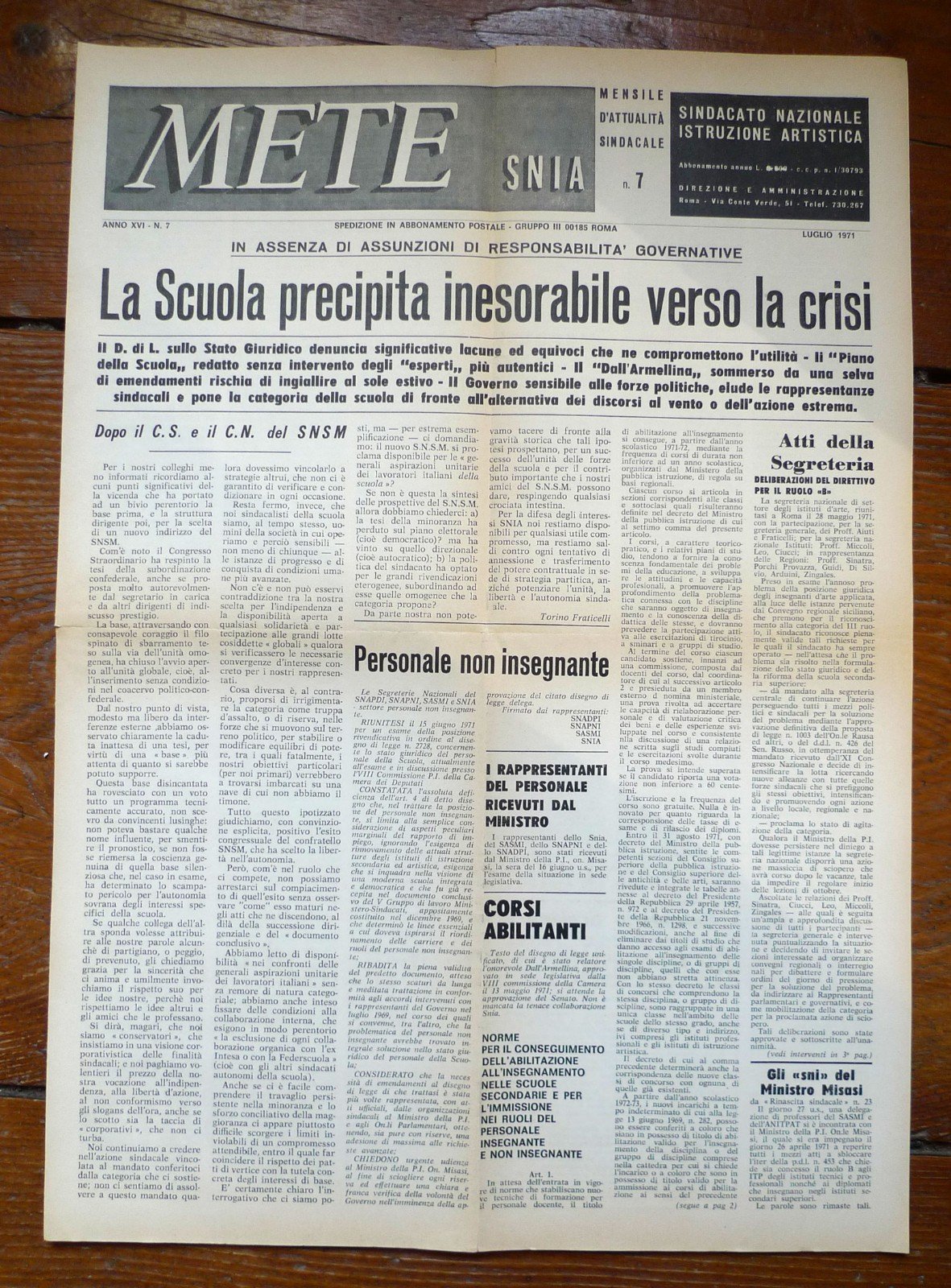 METE SNIA ANNO XVI n.7 luglio 1971.Sindacato Nazionale Istruzione Artistica.Mensile d'attualità sindacale.49,5x35 cm., pp.4,peso: g.300cod.10070CONDIZIONI DEL PERIODICO: buone,piegato in 4,bruniture ai margini e in corrispondenzadelle pieghe,strappetti ai margini