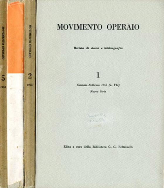 4 v. (826 p.) : ill. ; 24 x 16 cm. A. 7., N. 1 gennaio-febbraio 1955; n. 2, marzo-aprile 1955; n. 3-4, maggio-agosto 1955; n. 5, settembre-ottobre 1955; manca il n. 6, novembre-dicembre 1955. In allegato indice dell'annata 1954. La rivista «Movimento operaio» fondata nel 1949 è stata l'espressione più intensa della nuova stagione della storiografia italiana dedicata alla storia del movimento operaio e socialista. Fino al 1953 la rivista venne diretta da Gianni Bosio, intellettuale d'origine mantovana e d'orientamento socialista, dopo a seguito di una polemica inconciliabile fra il fondatore e l'editore Giangiacomo Feltrinelli, la rivista passò alla Biblioteca Feltrinelli e venne diretta da Armando Saitta. La rivista raccolse all'epoca le firme più prestigione dei giovani storici italiani tra i quali si ricordano: Luciano Cafagna, Gino Cerrito, Luigi Cortesi, Franco Della Peruta, Antonio Lucarelli, Gastone Manacorda, Pier Carlo Masini, Stefano Merli, Claudio Pavone, Giovanni Pirelli, Ernesto Ragionieri, Aldo Raimondi, Enzo Santarelli, Leo Valiani, Renato Zangheri. La rivista cessò le pubblicazioni con il n. 6 (novembre-dicembre) del 1956. Brossura editoriale, coperta di cartoncino flessibile di colore grigio chiaro. Tutti i fascicoli ben conservati senza difetti, solo con leggeri segni del tempo (ingiallimento della carta e dei profili della coperta). Codice libreria 2607.