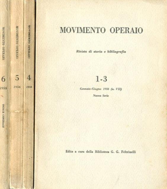 5 v. (1021 p.) : ill. ; 24 x 16 cm. A. 7., N. 1-3 gennaio-giugno 1956; n. 4, luglio-agosto 1956; n. 5, settembre-ottobre 1956; n. 6, novembre-dicembre 1956 (contiene l'indice generale della rivista). La rivista «Movimento operaio» fondata nel 1949 è stata l'espressione più intensa della nuova stagione della storiografia italiana dedicata alla storia del movimento operaio e socialista. Fino al 1953 la rivista venne diretta da Gianni Bosio, intellettuale d'origine mantovana e d'orientamento socialista, dopo a seguito di una polemica inconciliabile fra il fondatore e l'editore Giangiacomo Feltrinelli, la rivista passò alla Biblioteca Feltrinelli e venne diretta da Armando Saitta. La rivista raccolse all'epoca le firme più prestigione dei giovani storici italiani tra i quali si ricordano: Luciano Cafagna, Gino Cerrito, Luigi Cortesi, Franco Della Peruta, Antonio Lucarelli, Gastone Manacorda, Pier Carlo Masini, Stefano Merli, Claudio Pavone, Giovanni Pirelli, Ernesto Ragionieri, Aldo Raimondi, Enzo Santarelli, Leo Valiani, Renato Zangheri. La rivista cessò le pubblicazioni con il n. 6 (novembre-dicembre) del 1956. Brossura editoriale, coperta di cartoncino flessibile di colore grigio chiaro. Tutti i fascicoli ben conservati senza difetti, solo con leggeri segni del tempo (ingiallimento della carta e dei profili della coperta). Codice libreria 2608.