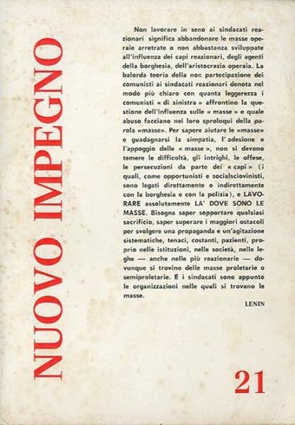 126 p. ; 25 x 17 cm. «Nuovo impegno», rivista bimestrale di letteratura venne fondata a Pisa nel 1965 da un gruppo di giovani intellettuali provenienti dalle file delle organizzazioni del movimento operaio e dai partiti storici della sinistra. Tra questi si ricordano Romano Luperini, Franco Petroni (Direttore Responsabile), Gianfranco Ciabatti e Carlo Alberto Madrignani. La rivista è nota per essere stata una di quelle che anticiparono culture e idee del "movimento di contestazione" che esplose nel biennio 1968-69. Nei primi anni l'interesse principale della redazione della rivista fu quello letterario e culturale, con la rivendicazione - fin dal titolo - di un nuovo impegno degli intellettuali in ambito sociale e politico. All'inizio si parlava di "cultura rivoluzionaria" e di "letteratura di opposizione"; il primo numero presentava un carteggio tra Gianfranco Ciabatti e Franco Fortini. Dopo pochi numeri la rivista lasciava decadere la sua prima autodefinizione di "bimestrale di letteratura" per occuparsi essenzialmente di problemi politici, teorici e culturali connessi alla critica della società capitalista. La svolta avvenne nel 1967 e nasceva dalla convinzione che "una cultura rivoluzionaria era possibile solo in presenza di una pratica rivoluzionaria". Prima lavorò in rapporto con il gruppo toscano de «Il potere operaio» pisano che editava il giornale omonimo, poi - dopo lo scioglimento del gruppo - continuò le pubblicazioni come organo, sia pure indiretto, della «Lega dei comunisti» col sottotitolo «Rivista trimestrale marxista-leninista». «Nuovo impegno» ha continuato ad essere pubblicato fino al 1976 per 33 numeri complessivi. La sua esperienza si conclude con la partecipazione della «Lega dei Comunisti» e della redazione di «Nuovo Impegno» alla fondazione di Democrazia Proletaria nel 1977. Brossura editoriale, coperta in cartoncino flessibile plastificato lucido. Qualche segno del tempo alla coperta e al taglio, per il resto esemplare integro. Codice libreria 6313.